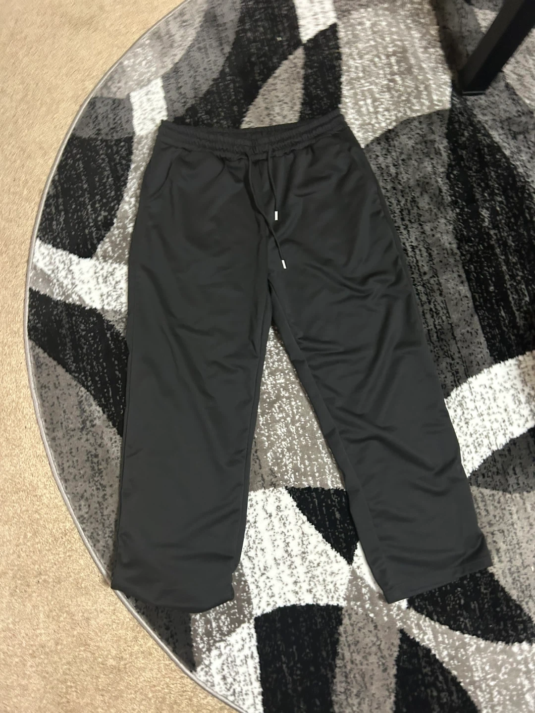These black track pants are a comfy choice for everyday wear. They're made from a polyester blend material. They feature an elastic waistband with a drawstring for a snug fit.