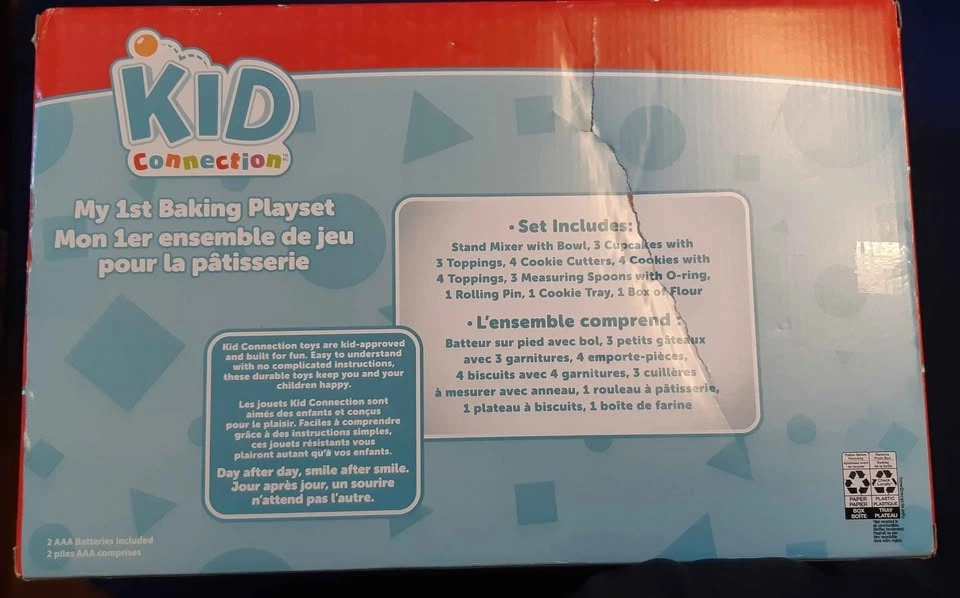 This is a Kid Connection My 1st Baking Playset. It is a 27-piece set designed for imaginative role-play. The set includes a battery-operated mixer and various accessories like cupcakes, cookies, and utensils. It requires 2 AAA batteries to power the electronic features. Brand new, never opened.