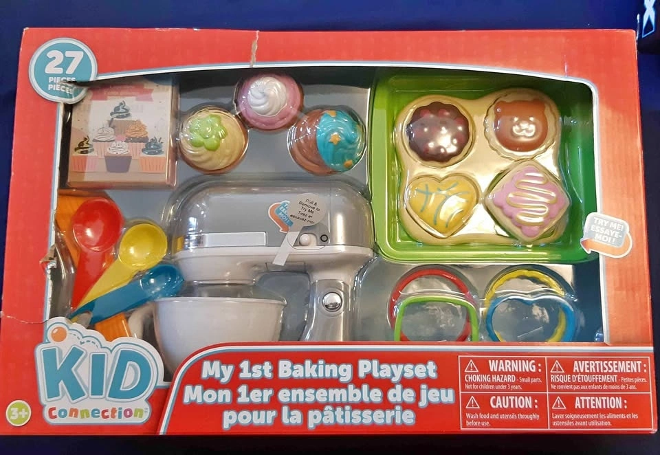 This is a Kid Connection My 1st Baking Playset. It is a 27-piece set designed for imaginative role-play. The set includes a battery-operated mixer and various accessories like cupcakes, cookies, and utensils. It requires 2 AAA batteries to power the electronic features. Brand new, never opened.