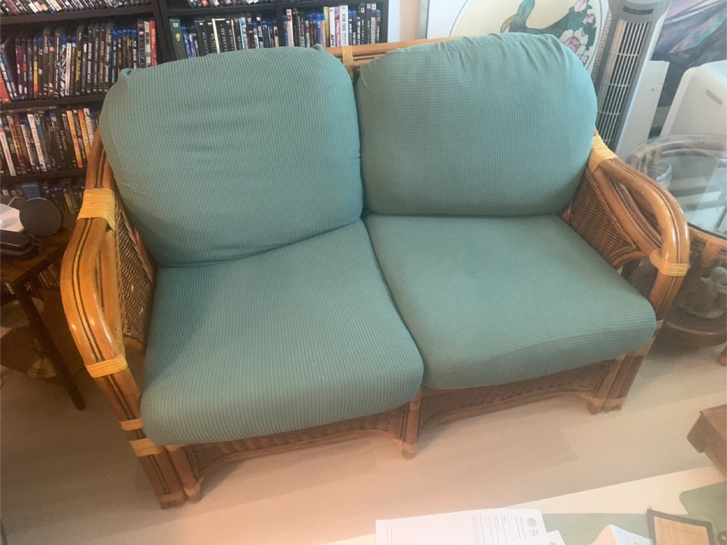 Two-seater sofa with a rattan frame and teal upholstered cushions. It's a comfortable and stylish addition to any living space. The frame is made of natural rattan with a woven detail.
