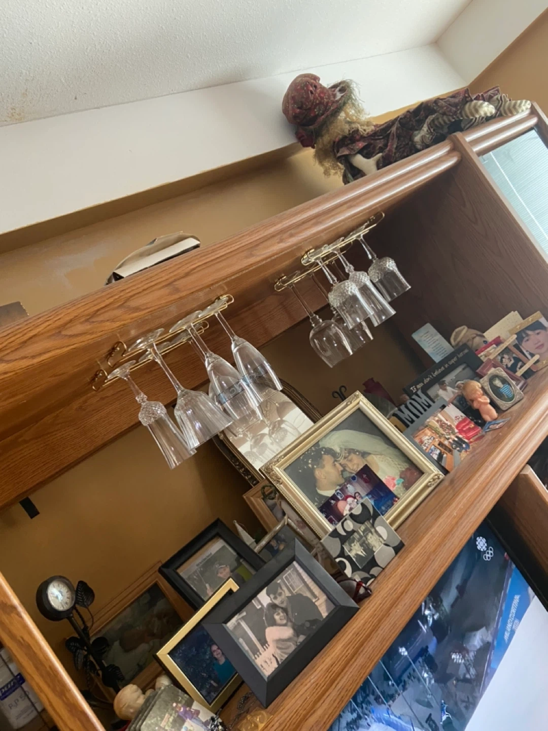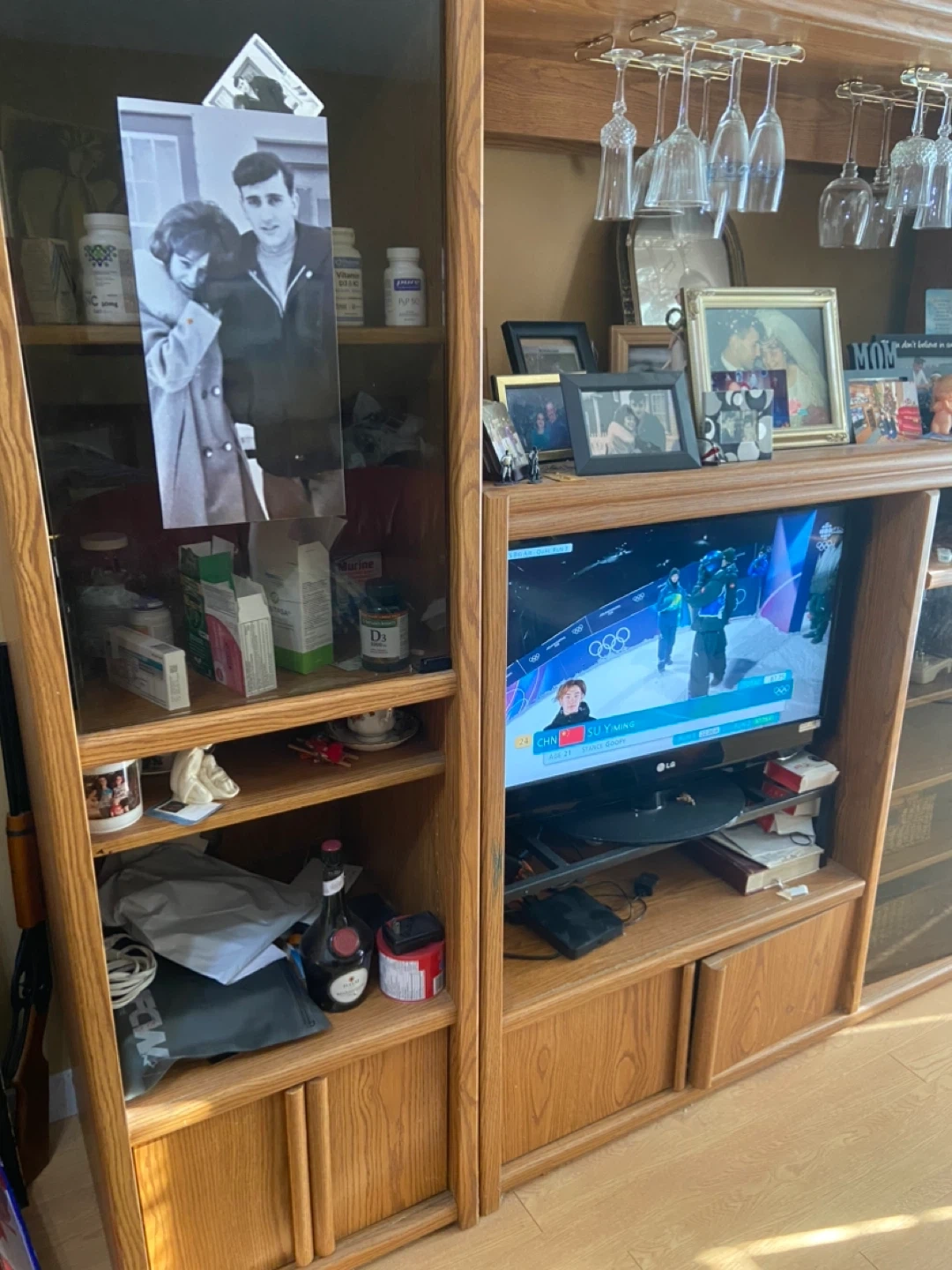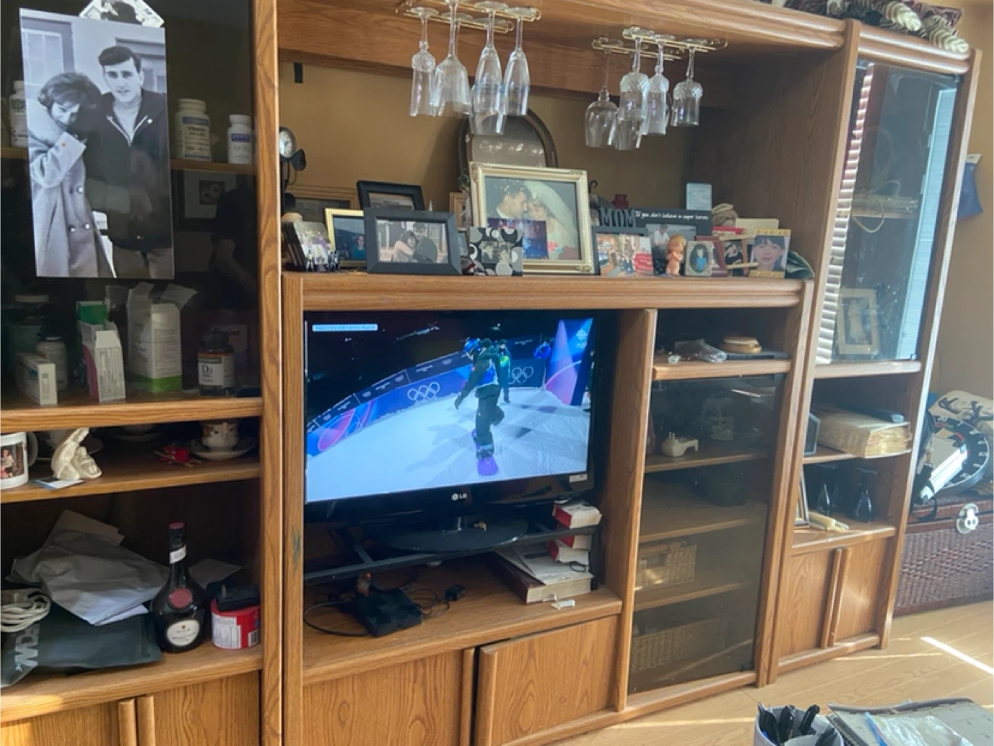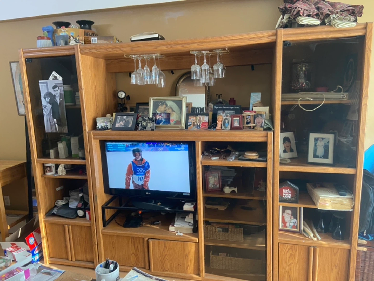 This is a large oak entertainment unit. It features multiple shelves, cabinet storage, and a built-in rack for hanging wine glasses. It's perfect for organizing your media and display items. The unit has a classic wood finish.