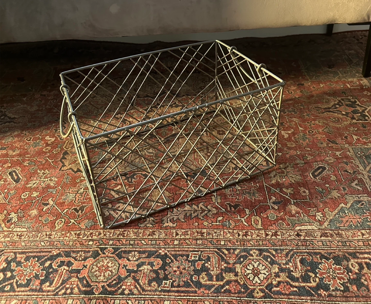 A metal storage basket with a criss-cross design and two convenient handles. Its metal construction makes it durable for various storage needs. This basket is great for organizing items in pantries, closets, or garages.