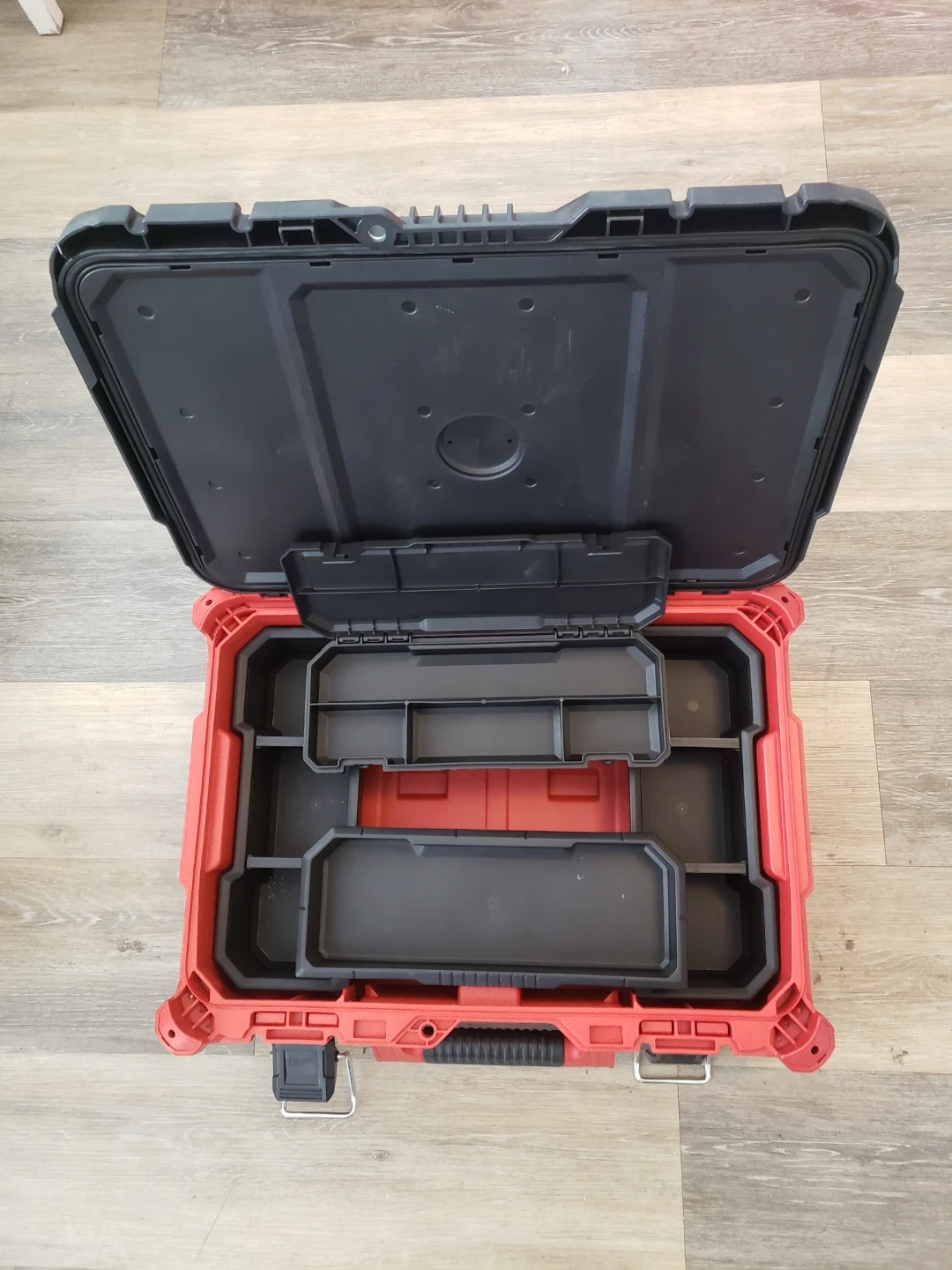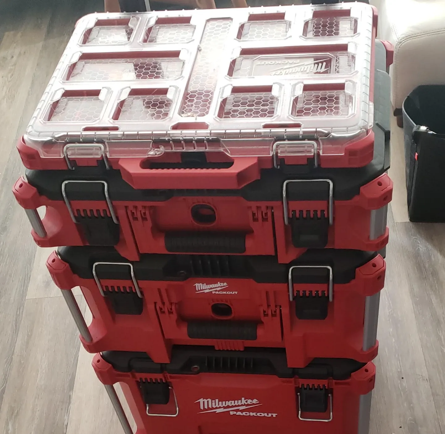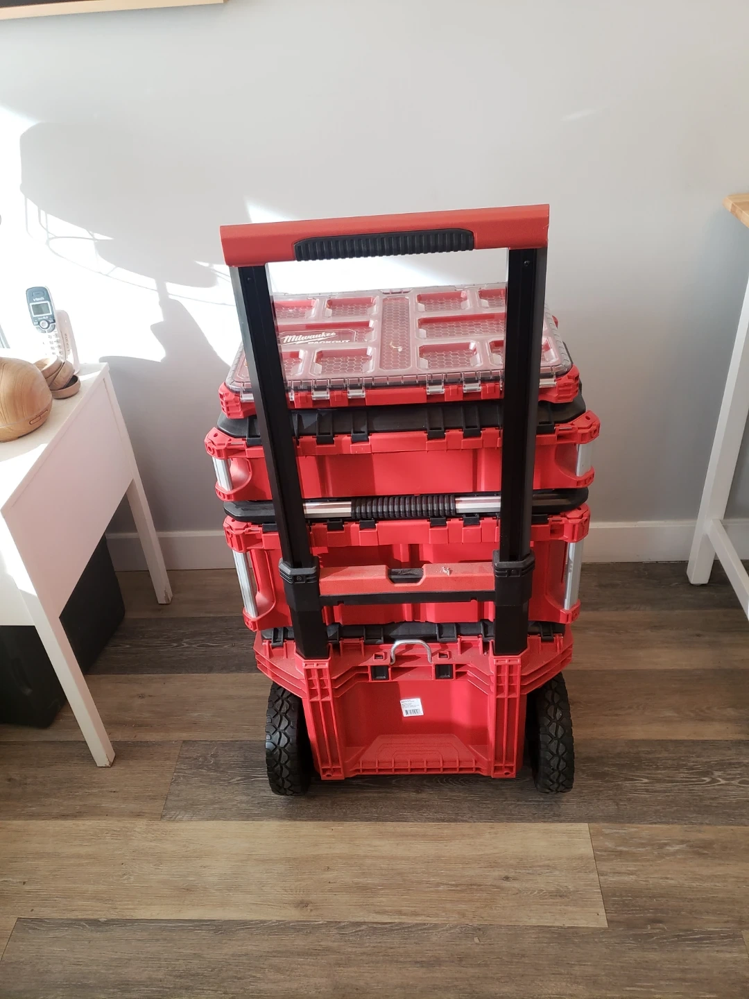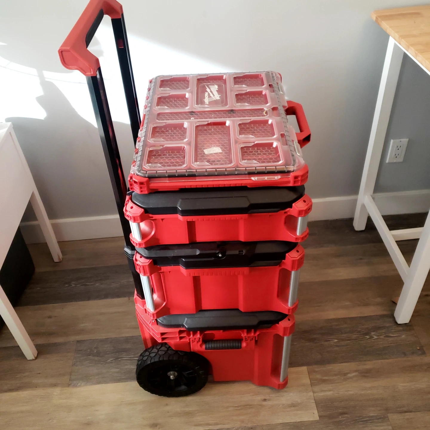 Selling a Milwaukee PACKOUT rolling tool box system. Includes a rolling cart, large tool box, and a small organizer. Sturdy construction for tradespeople. USED ONLY FOR TOOL STORAGE IN MY CONDO. NEVER USED ON A JOB SITE.