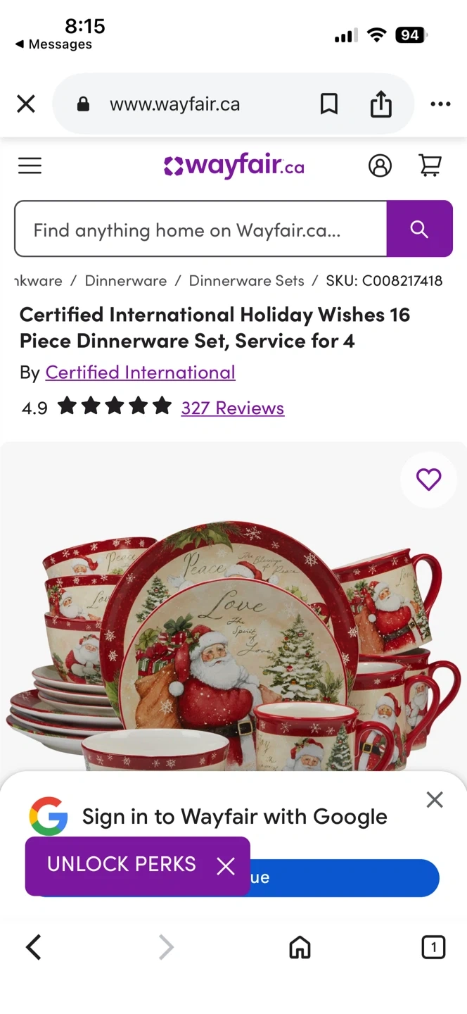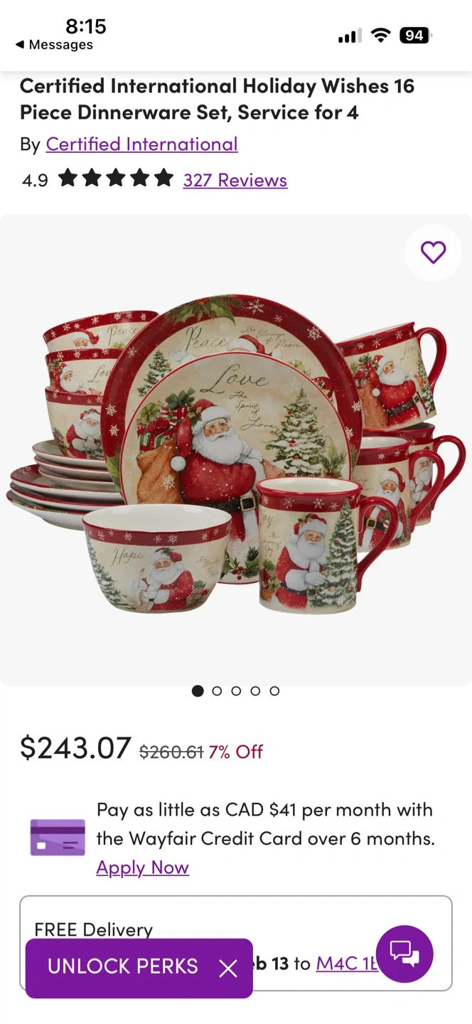 This Certified International dinnerware set features a festive Holiday Wishes design with Santa Claus and Christmas trees. It's a 16-piece set, serving 4 people. This collection is perfect for holiday gatherings and adding a touch of cheer to your table! Regular price $249.00. Sells for $125.00