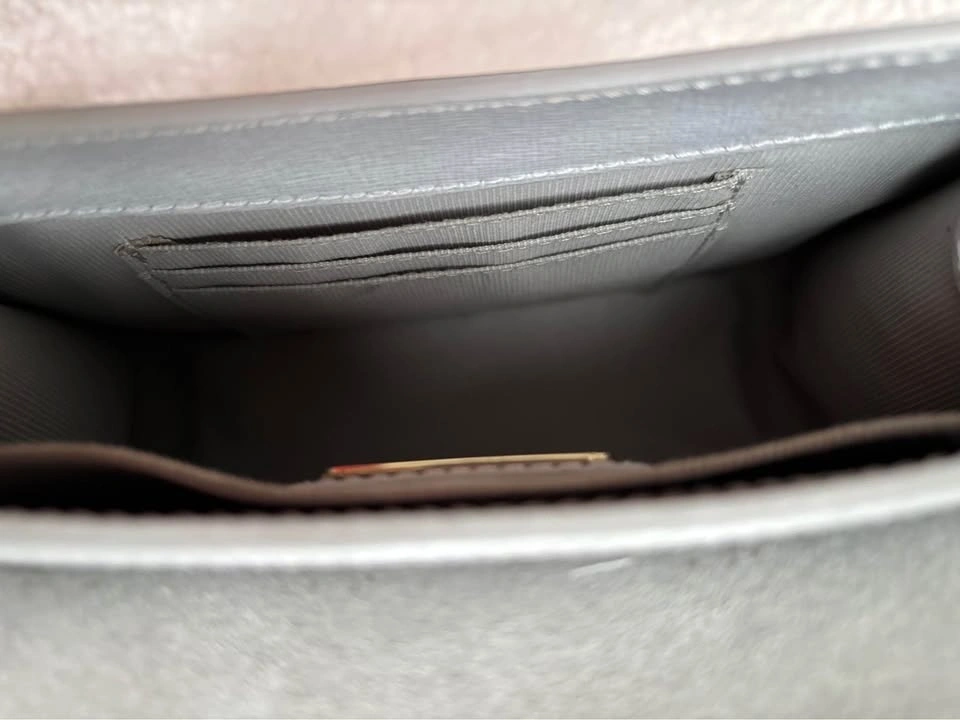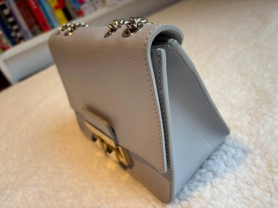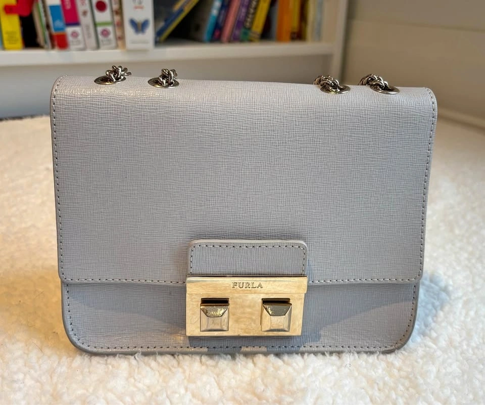 Chic Furla crossbody bag in light gray. Features elegant gold hardware. Measures 7.5In Wide X 5In High X 3.5In Deep. Shoulder Strap Drops 21In. Fold-Over Flap With Pushlock Closure.