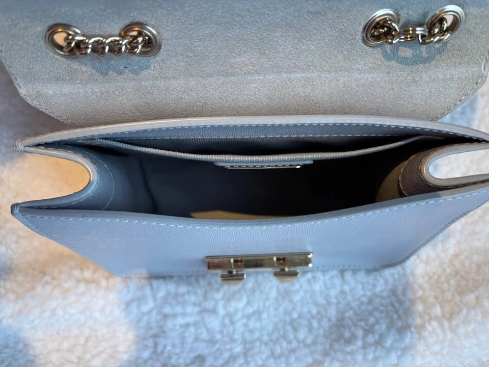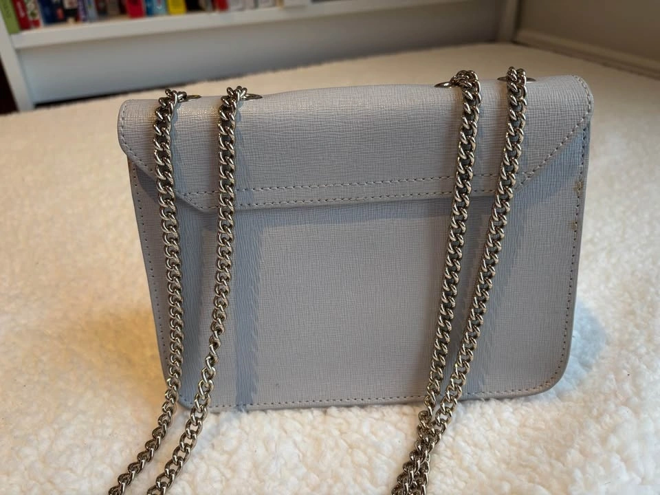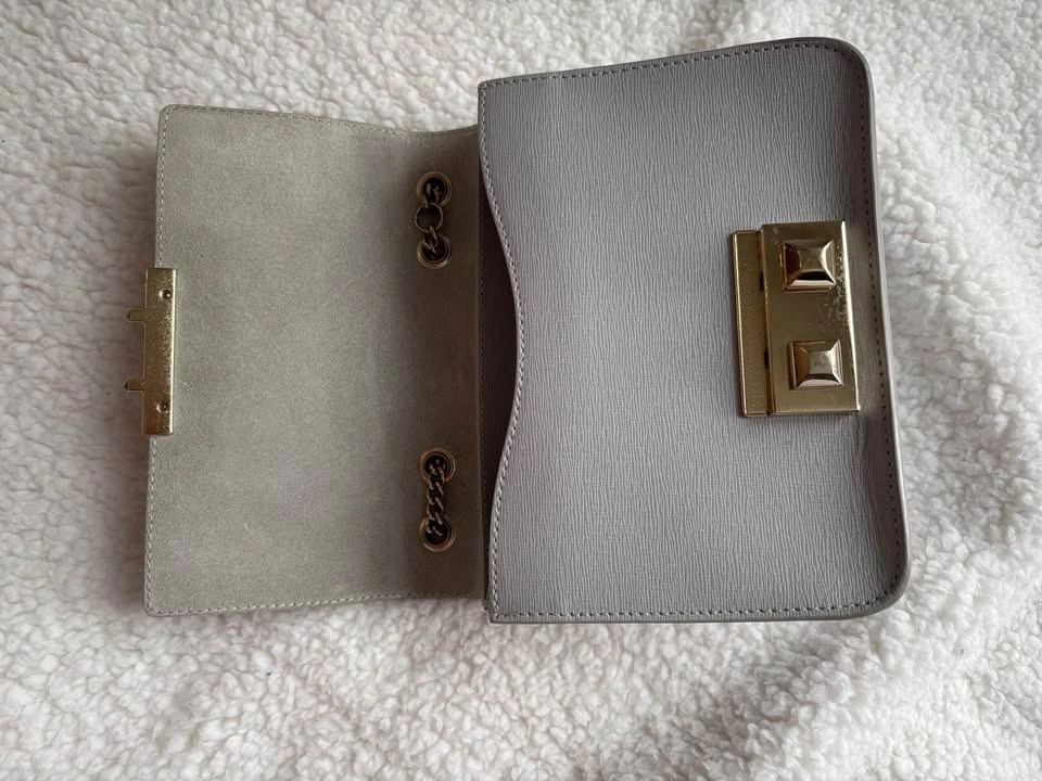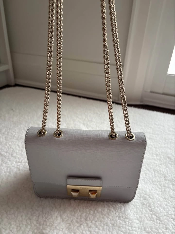 Chic Furla crossbody bag in light gray. Features elegant gold hardware. Measures 7.5In Wide X 5In High X 3.5In Deep. Shoulder Strap Drops 21In. Fold-Over Flap With Pushlock Closure.