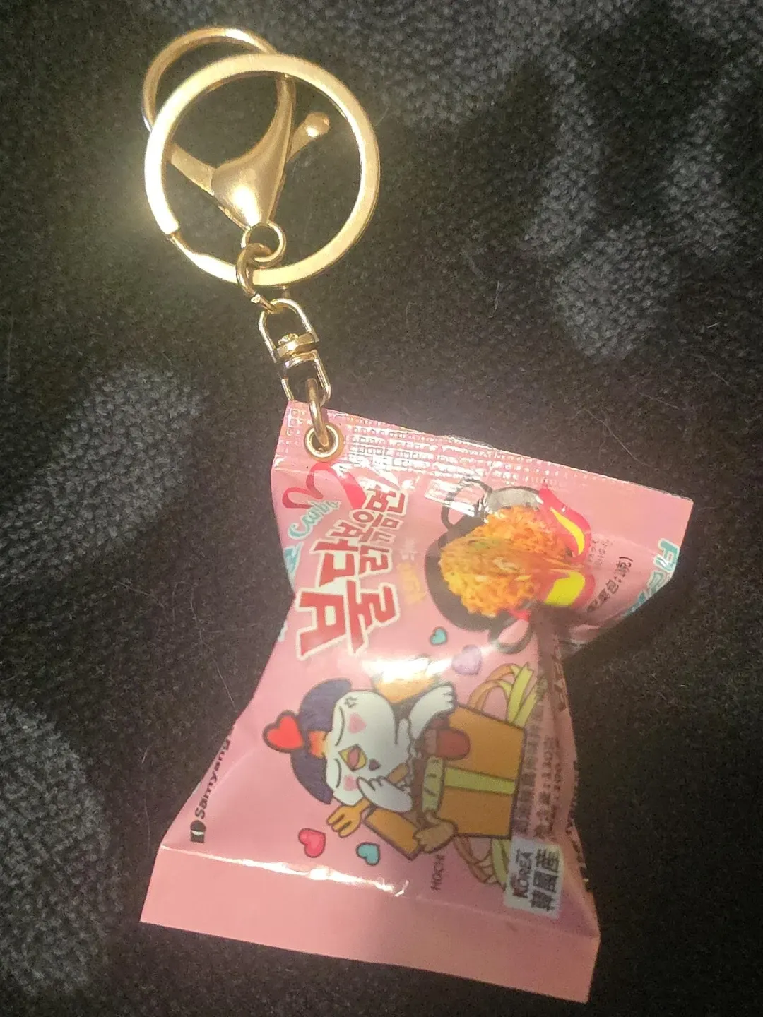 This is a cute keychain featuring a miniature package of Samyang Buldak noodles. It's got a playful cartoon design and a gold-toned clasp. A fun accessory for any fan of spicy ramen!