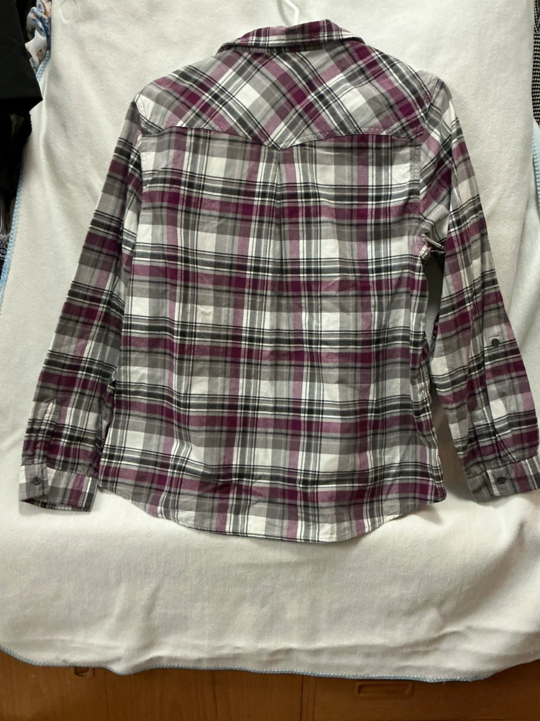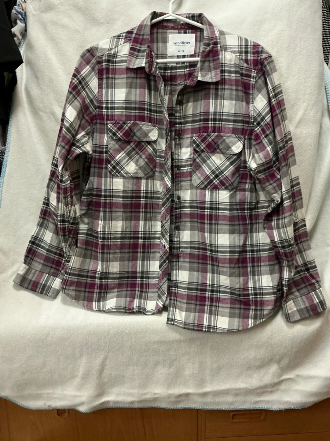 A comfy flannel shirt from WindRiver. It's XL/TG in size. It features a classic plaid pattern in grey, white, and plum. Buttons up the front with two chest pockets.