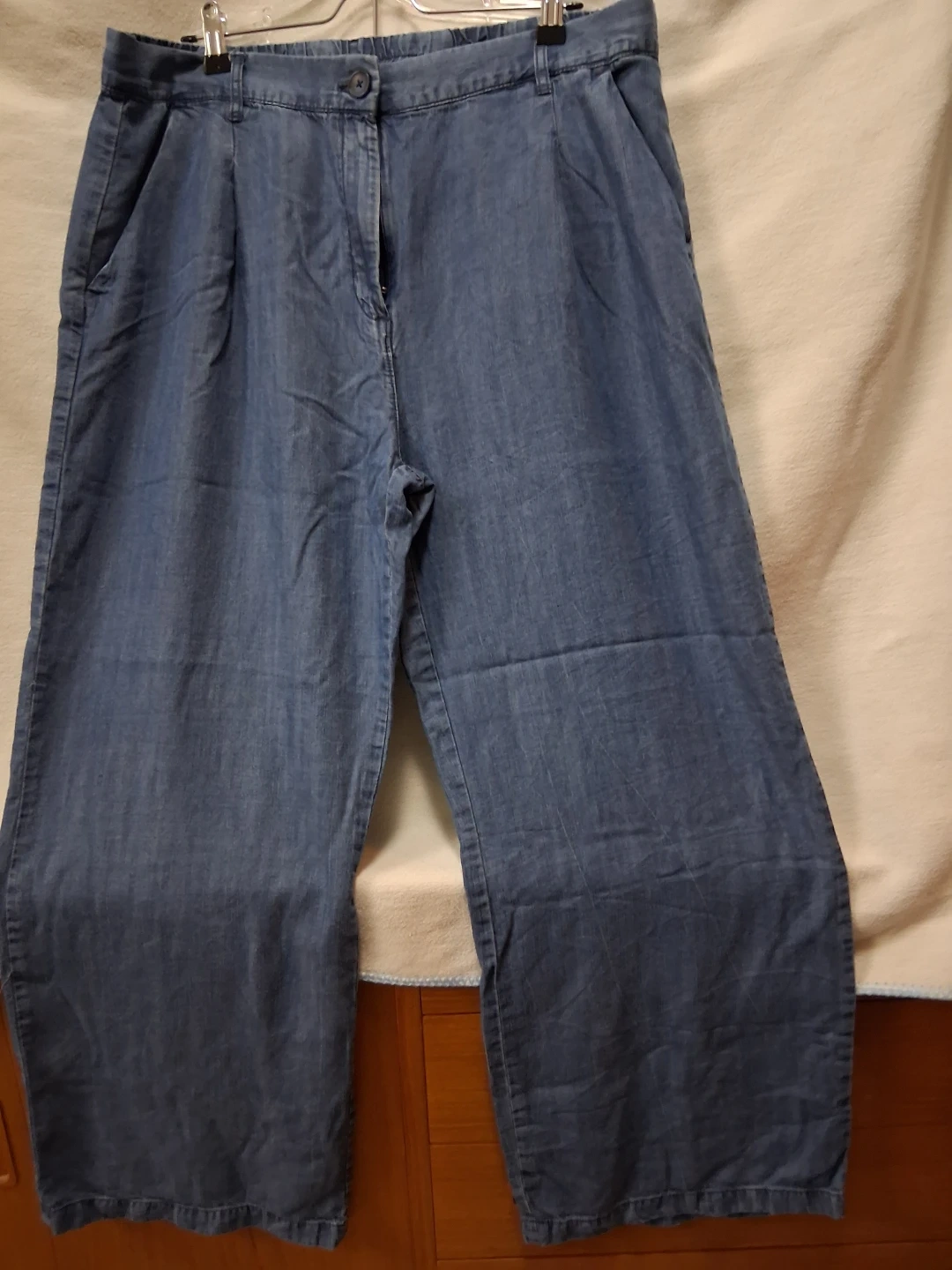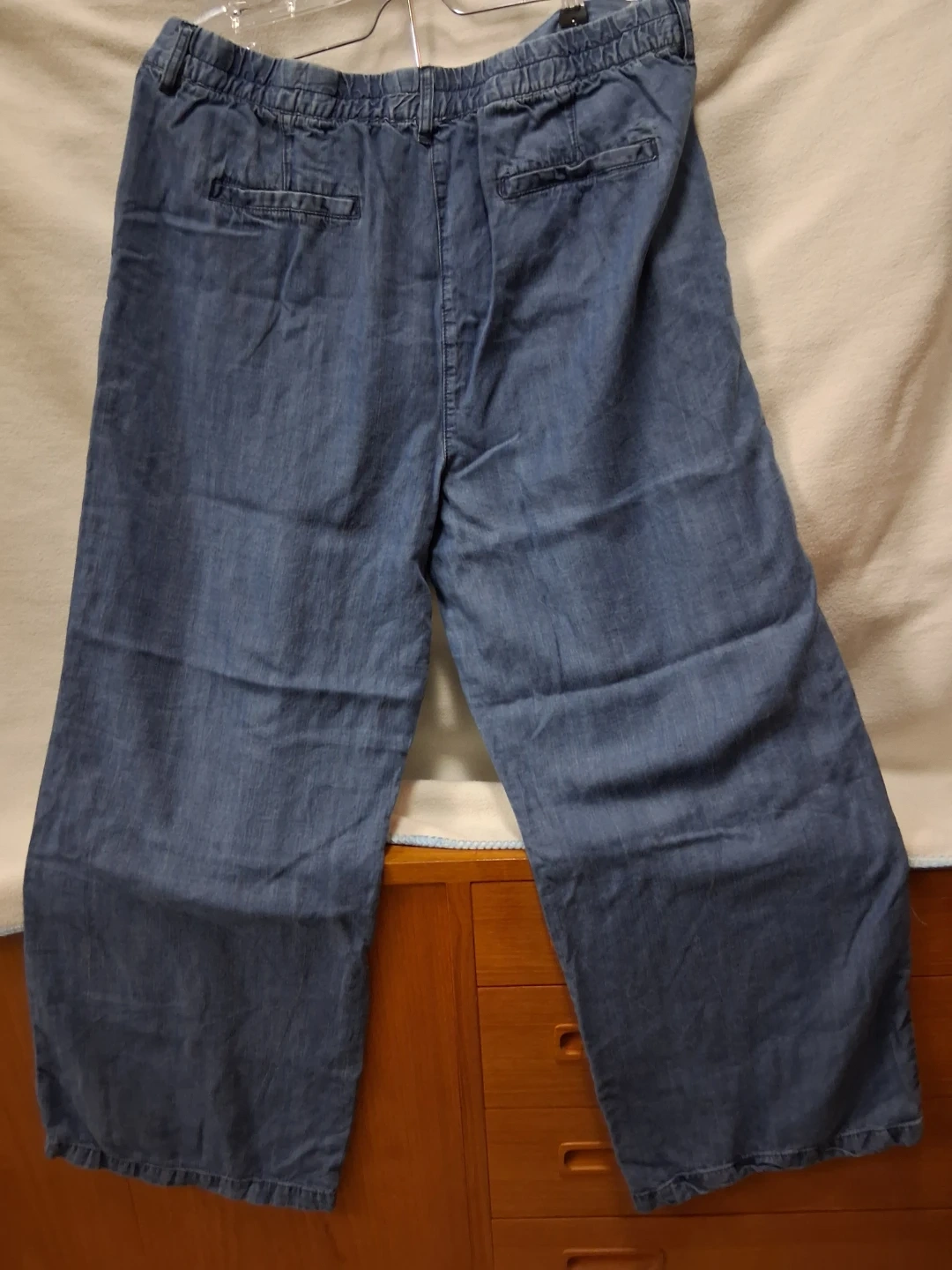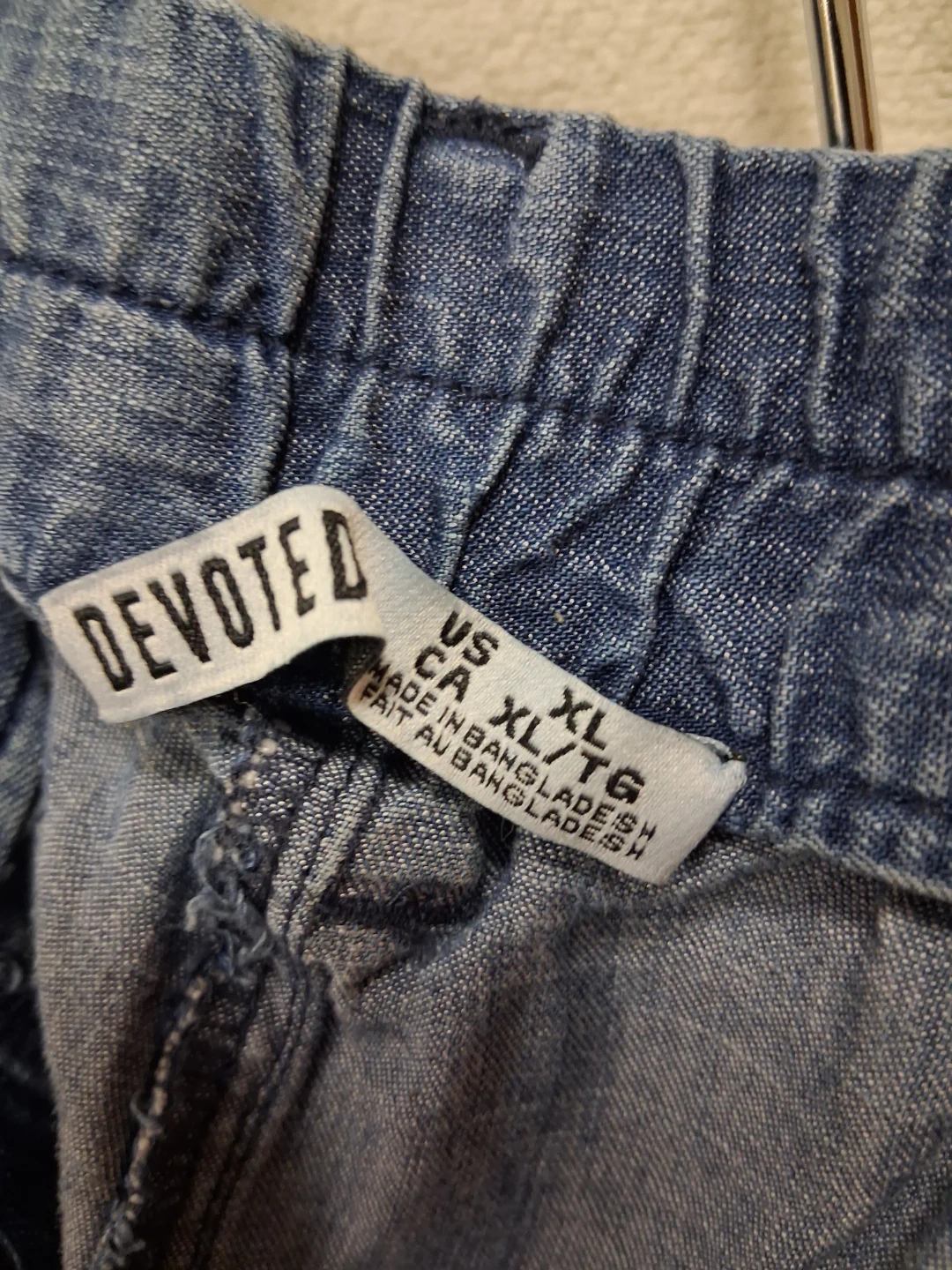 These are comfortable wide-leg jeans from Devoted. They're a light wash denim with an elastic waistband for easy wear. Made in Bangladesh.