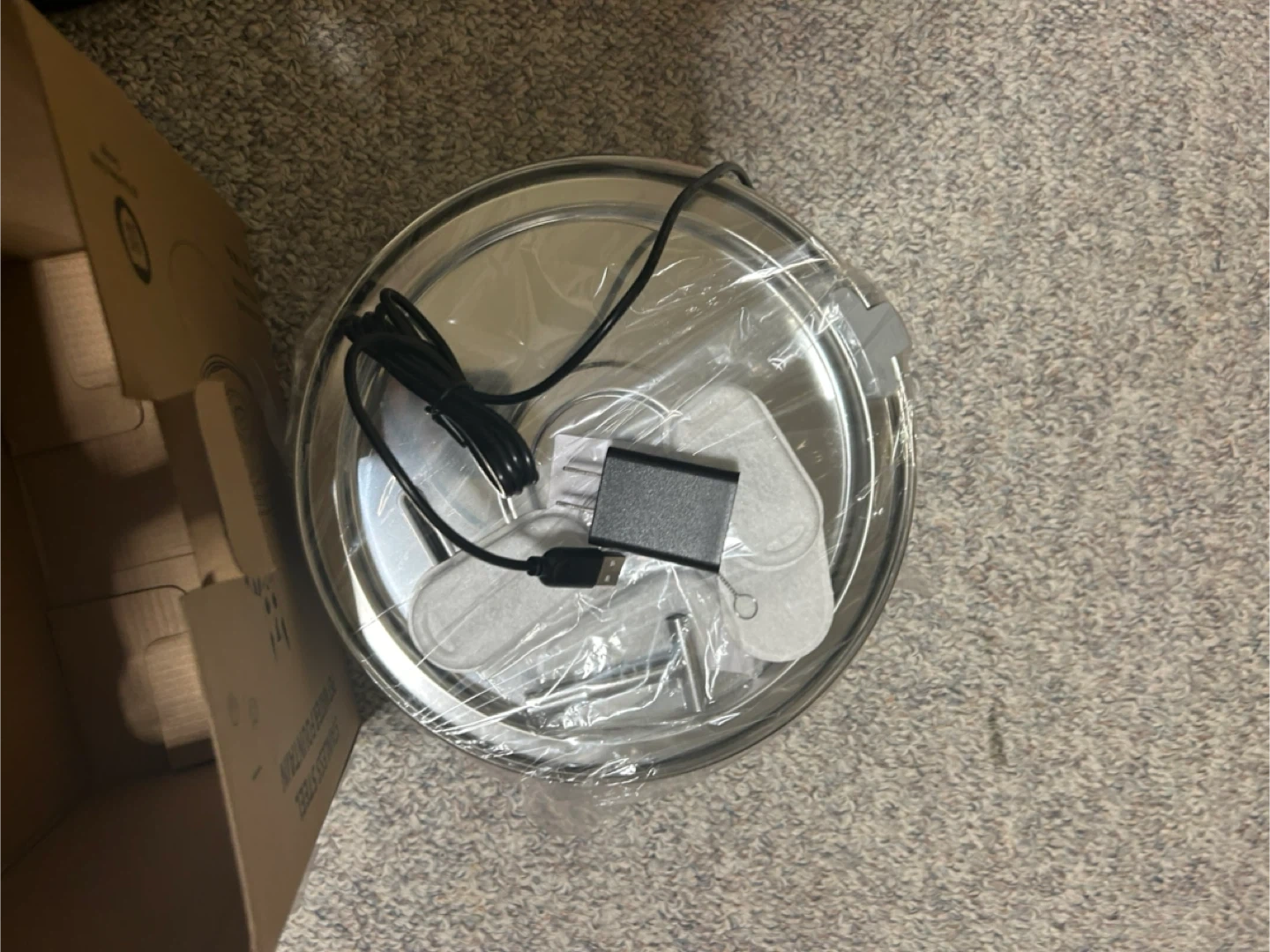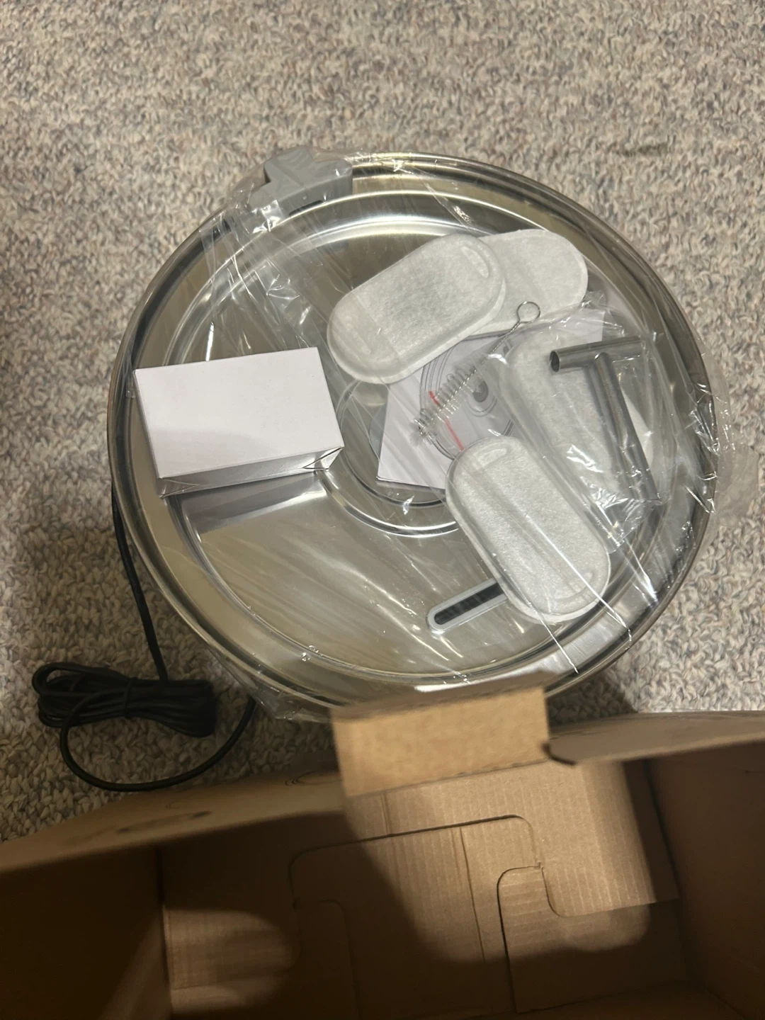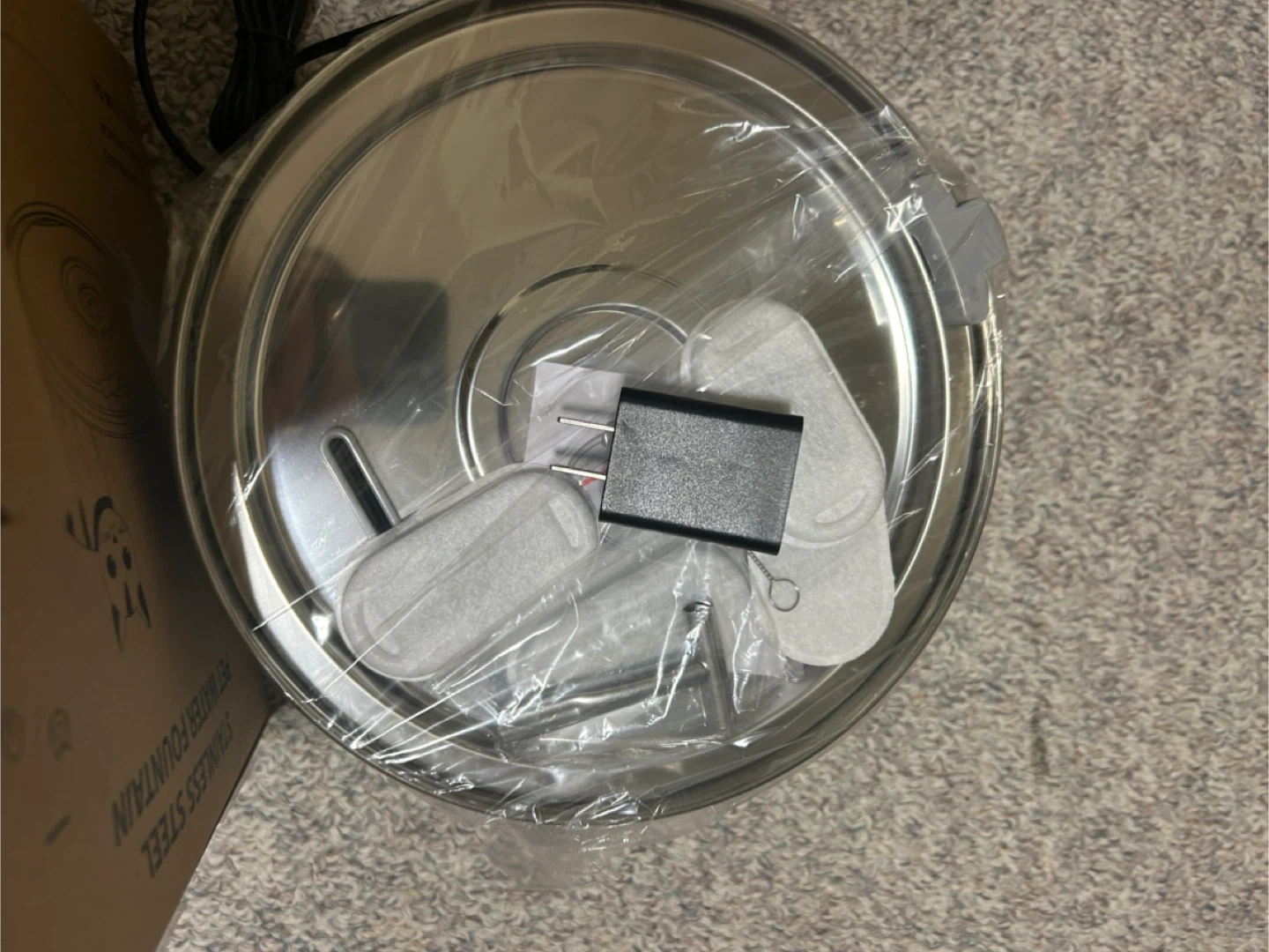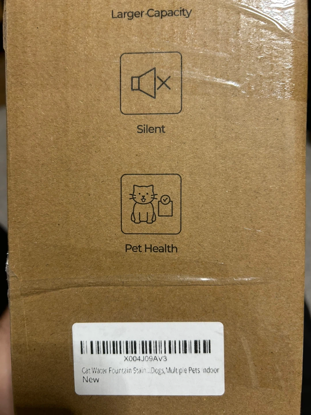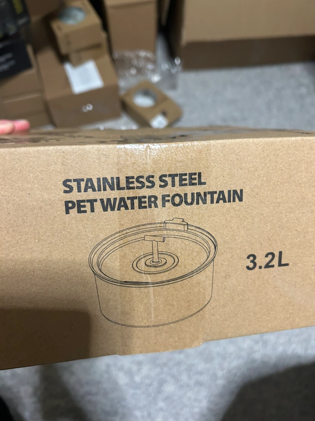 Stainless steel pet water fountain with a 3.2L (108 oz) capacity. It features a silent operation and is designed for pet health. Includes original box and accessories.