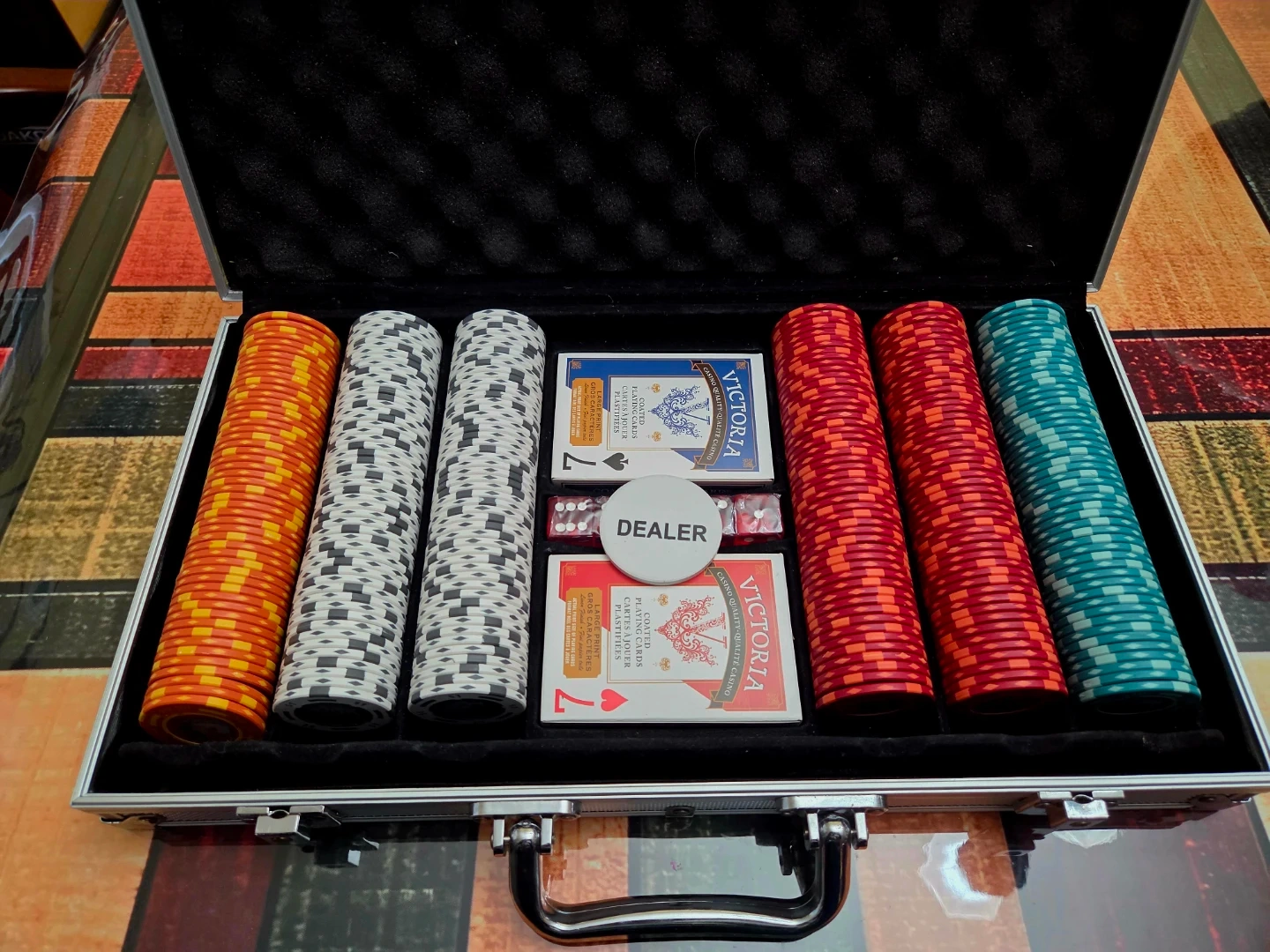 This set includes a variety of poker chips with different denominations and colours. It also comes with two decks of Victoria playing cards and dice. All items are stored in a silver-toned carrying case.