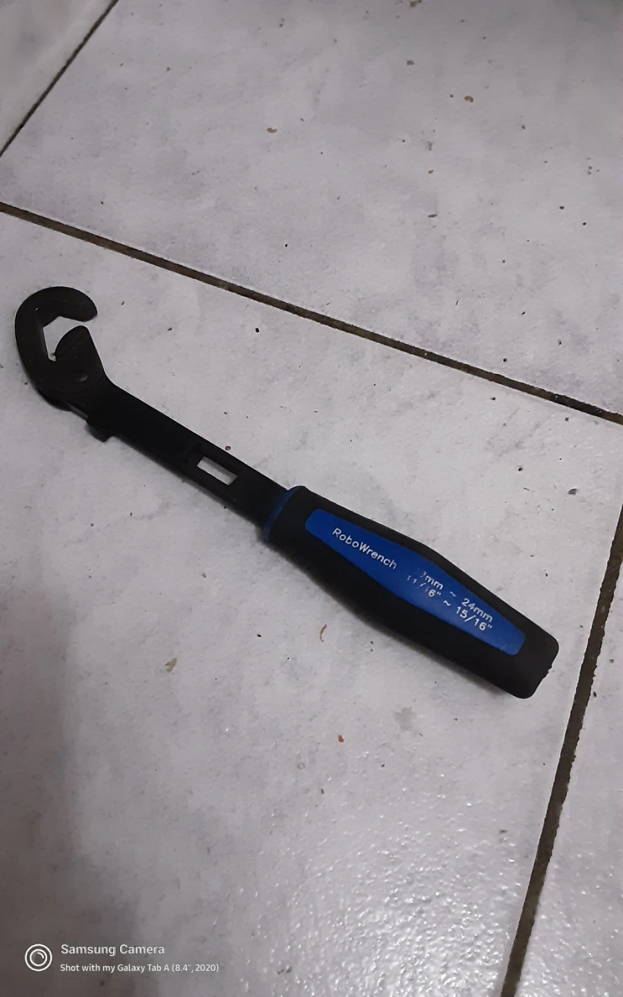 This is a RoboWrench adjustable wrench. It fits sizes from 11mm to 24mm, or 7/16" to 15/16". Its handy size makes it a useful tool for various tasks.