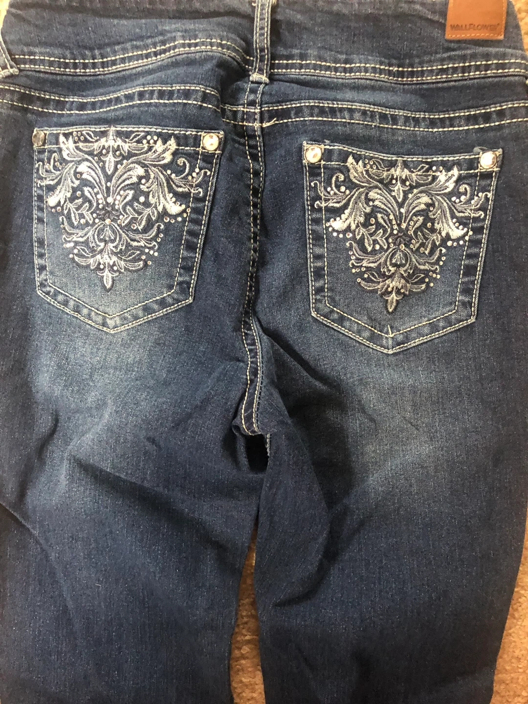 These Wallflower women's bootcut jeans are a size 7. They feature decorative embellishments on the back pockets. Denim material.