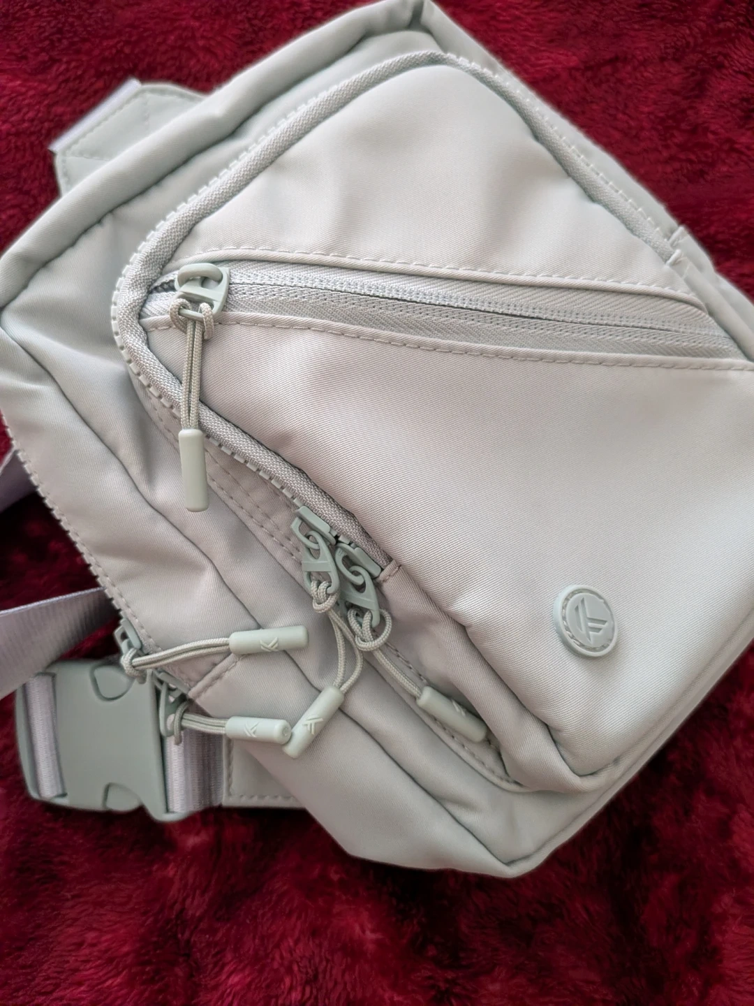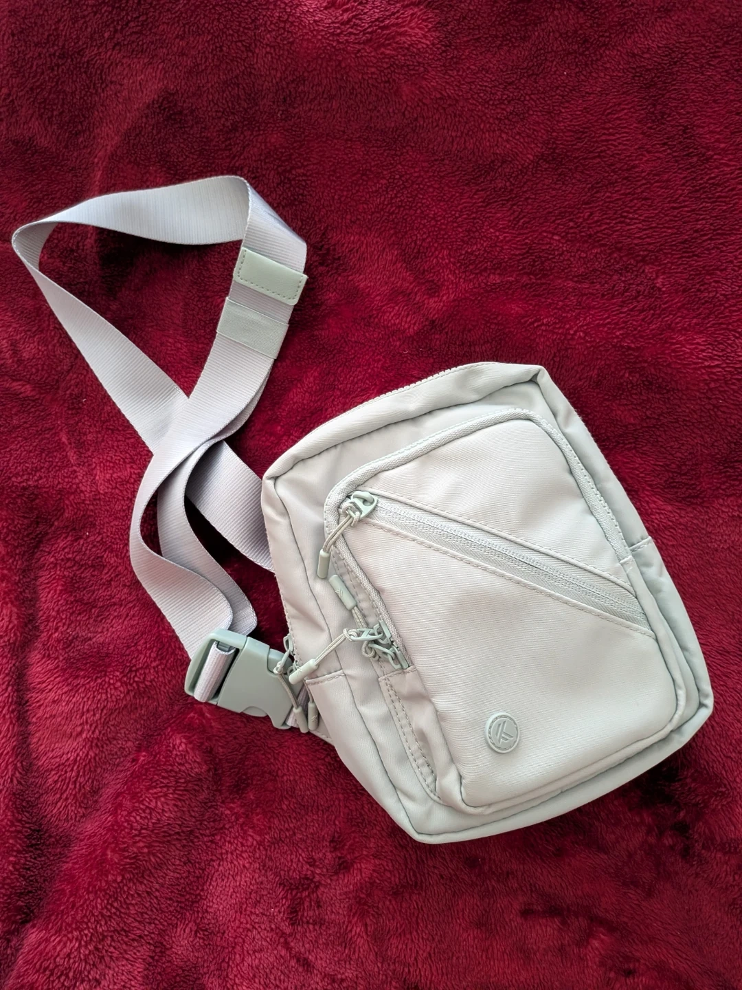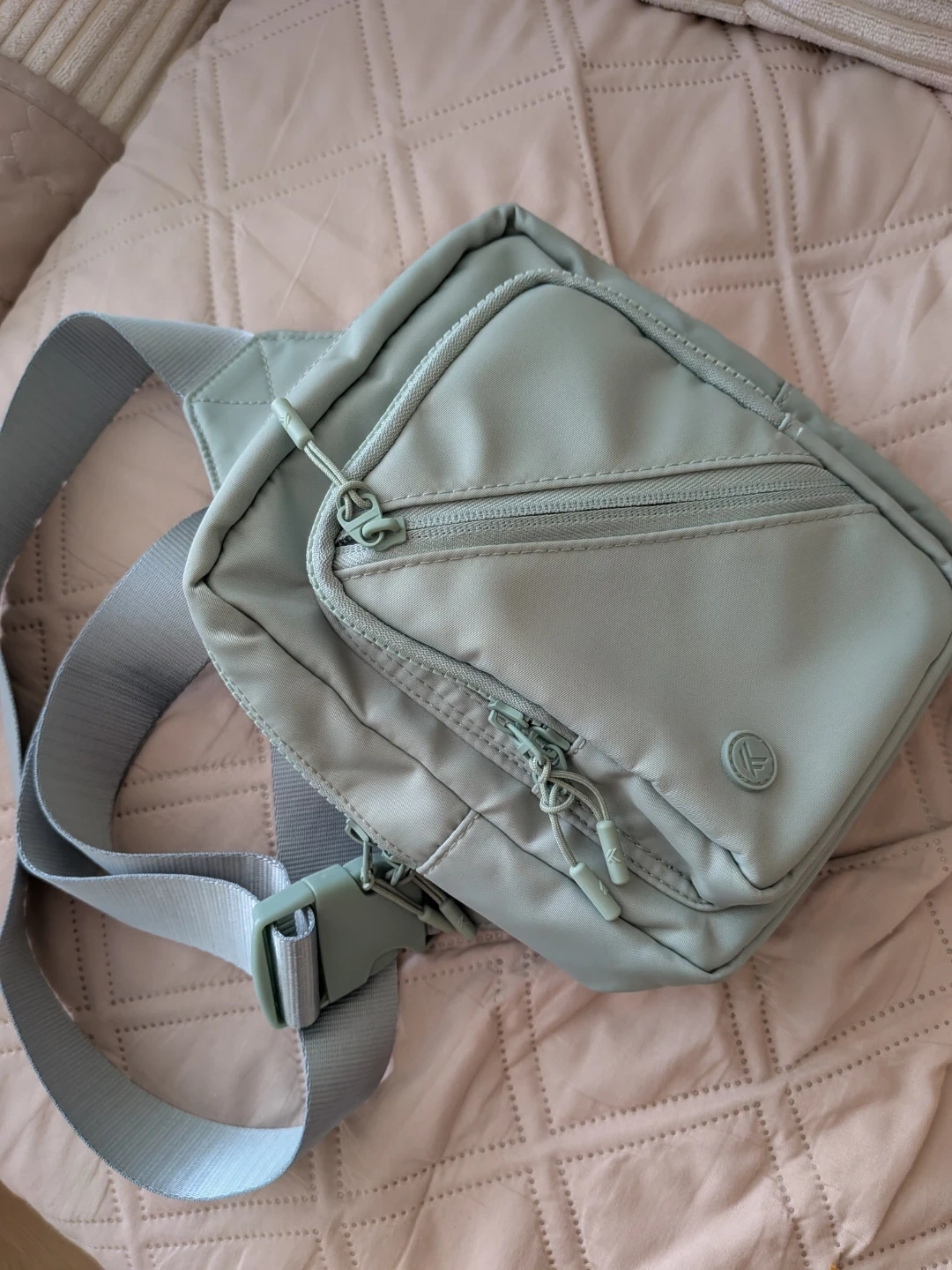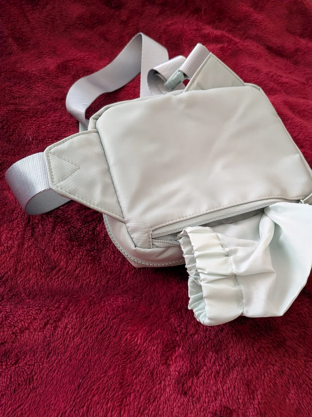 This Kyodan crossbody bag is a light mint green colour - tried taking photo in another light to show its adorable mint colour! Almost like new as I've only had it for less than a month and rarely used it - need something bigger to hold my planner. It's made of nylon and has a zippered main compartment with an interior pocket. All zippers work smoothly; no cosmetic flaws or structural damages. Also has a hidden bottle holder that is tucked into the back compartment (where you can also securely tuck away cash, keys, etc.). Make this your everyday bag!