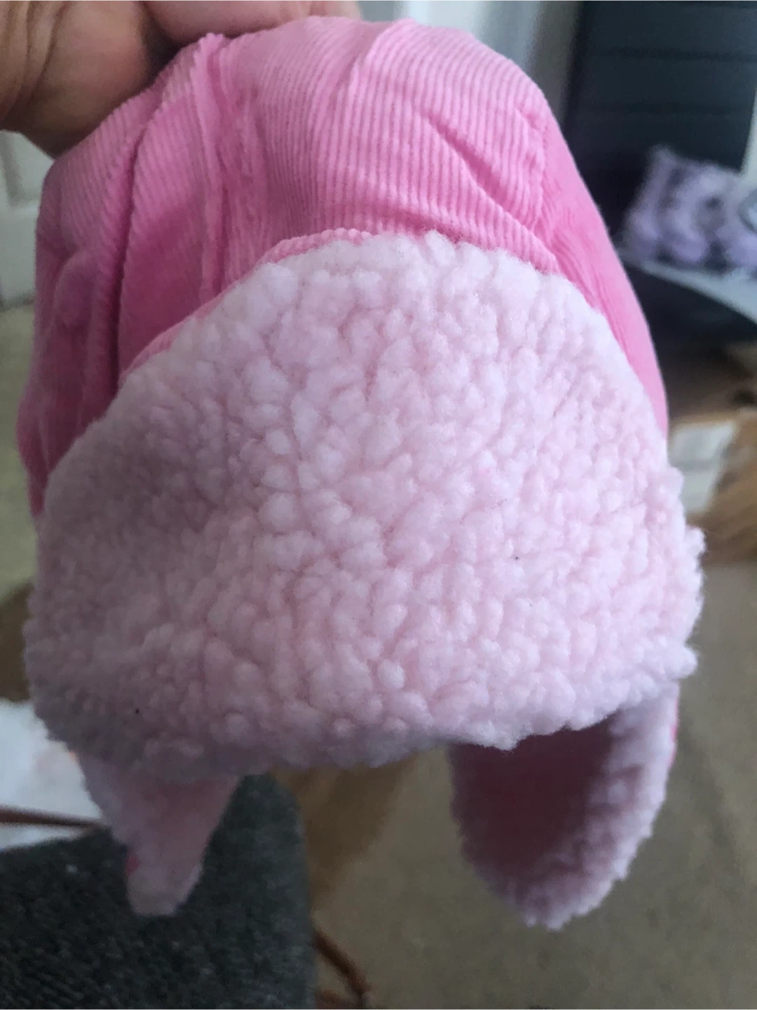 A warm pink corduroy trapper hat with a fluffy lining. It's perfect for keeping little ones cozy during colder weather.