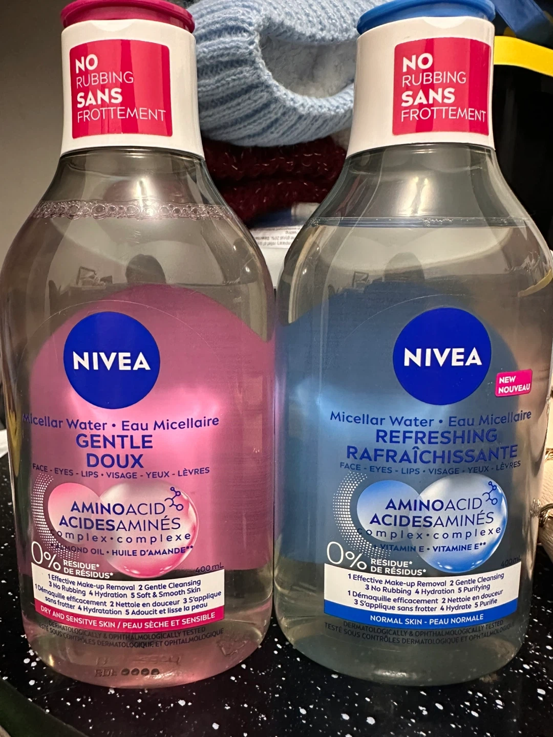 Two bottles of NIVEA Micellar Water are included: Gentle (for dry/sensitive skin) and Refreshing (for normal skin). Both are 400ml each and contain Aminoacids. They promise effective make-up removal without rubbing, offering hydration and leaving skin soft and smooth.