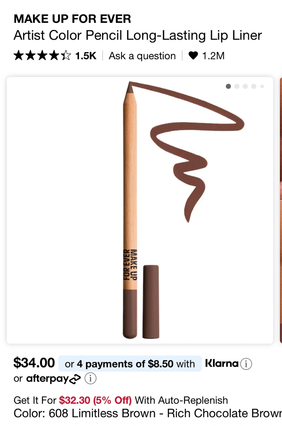 This is the MAKE UP FOR EVER Artist Color Pencil Long-Lasting Lip Liner. It's shade 608 Limitless Brown, a rich chocolate brown. This lip liner offers long-lasting wear for your lips.