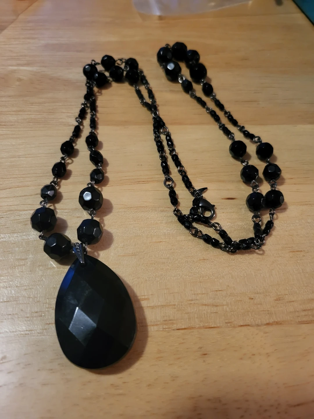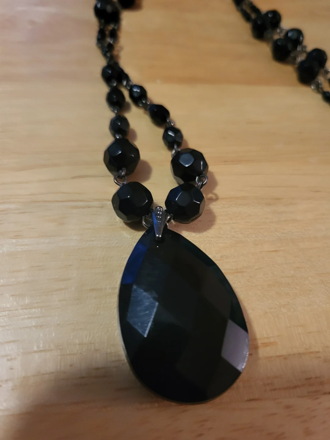 This black beaded necklace features a large faceted teardrop pendant. It has a delicate chain with smaller black beads and a secure clasp closure. The contrasting bead sizes add visual interest to the piece.