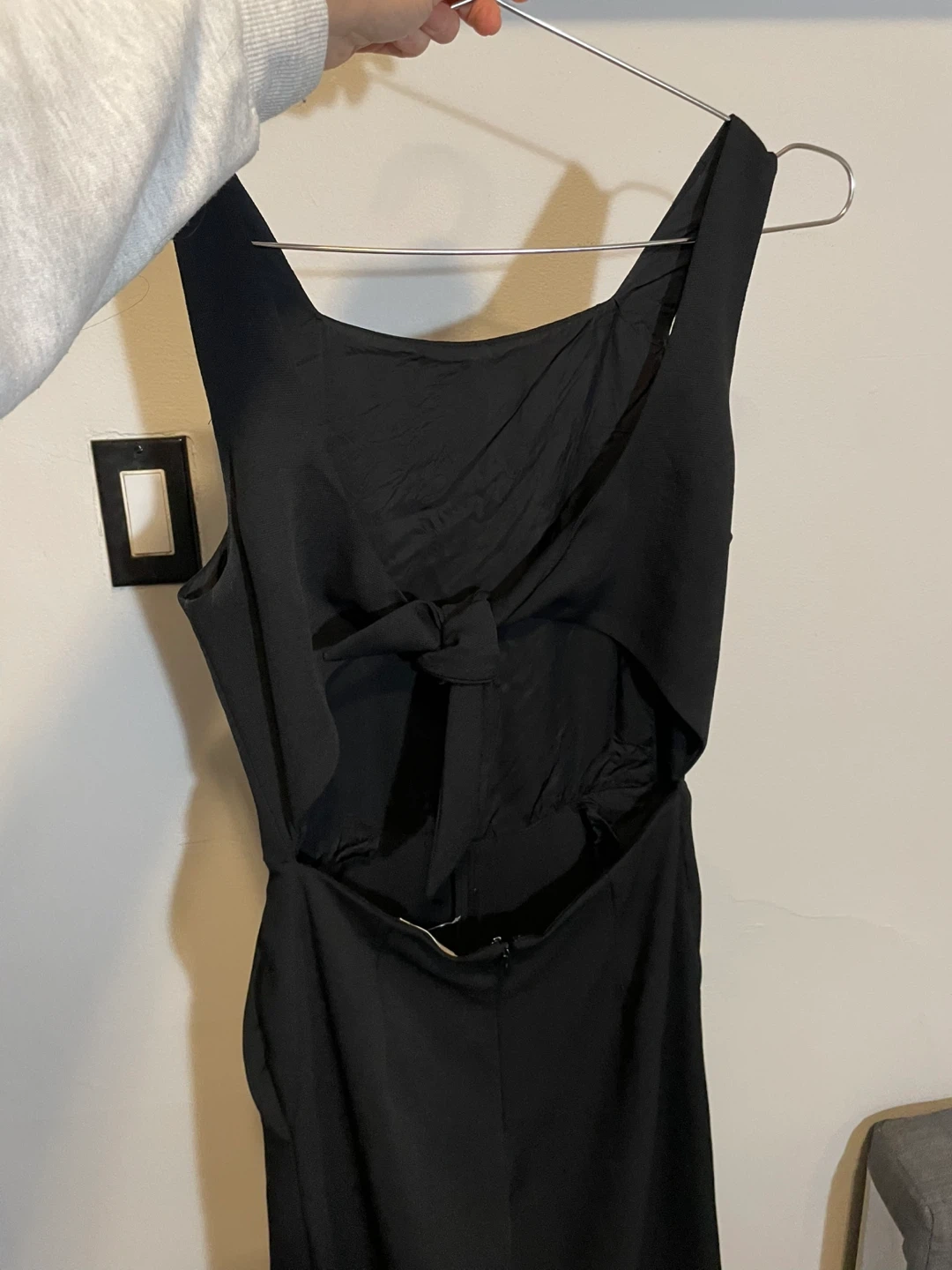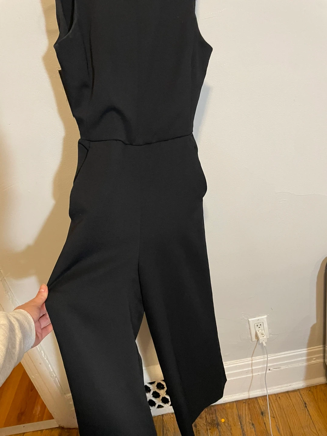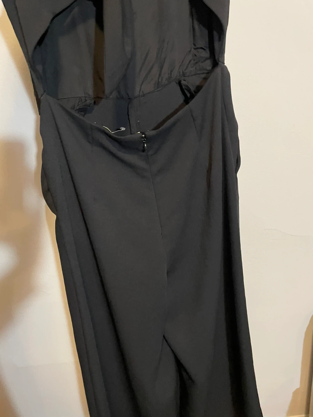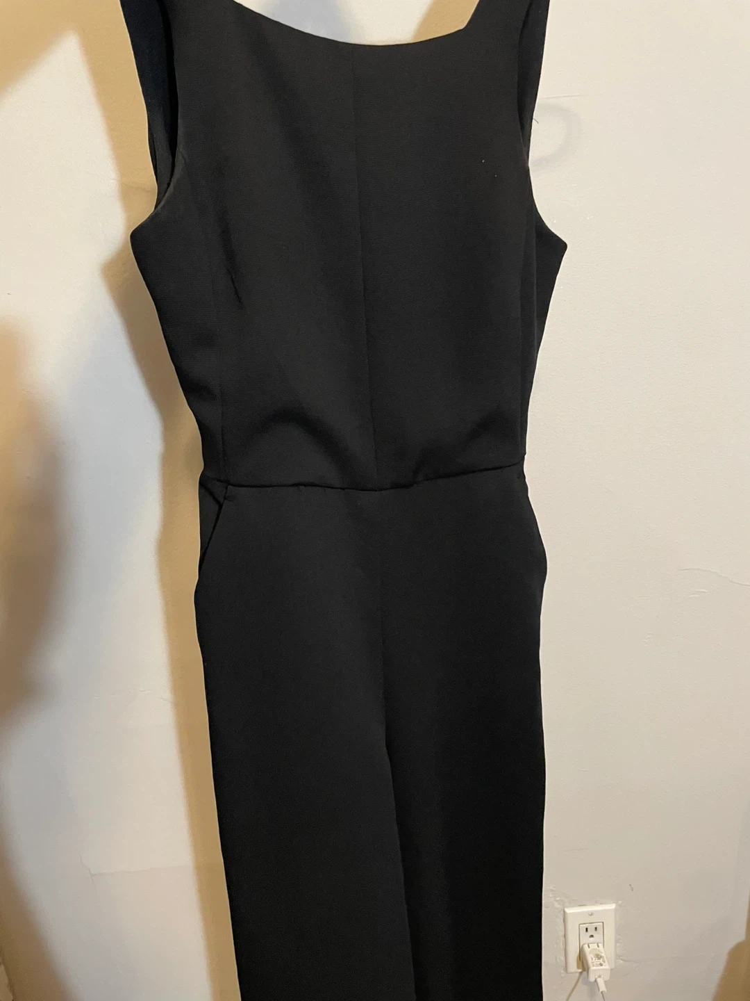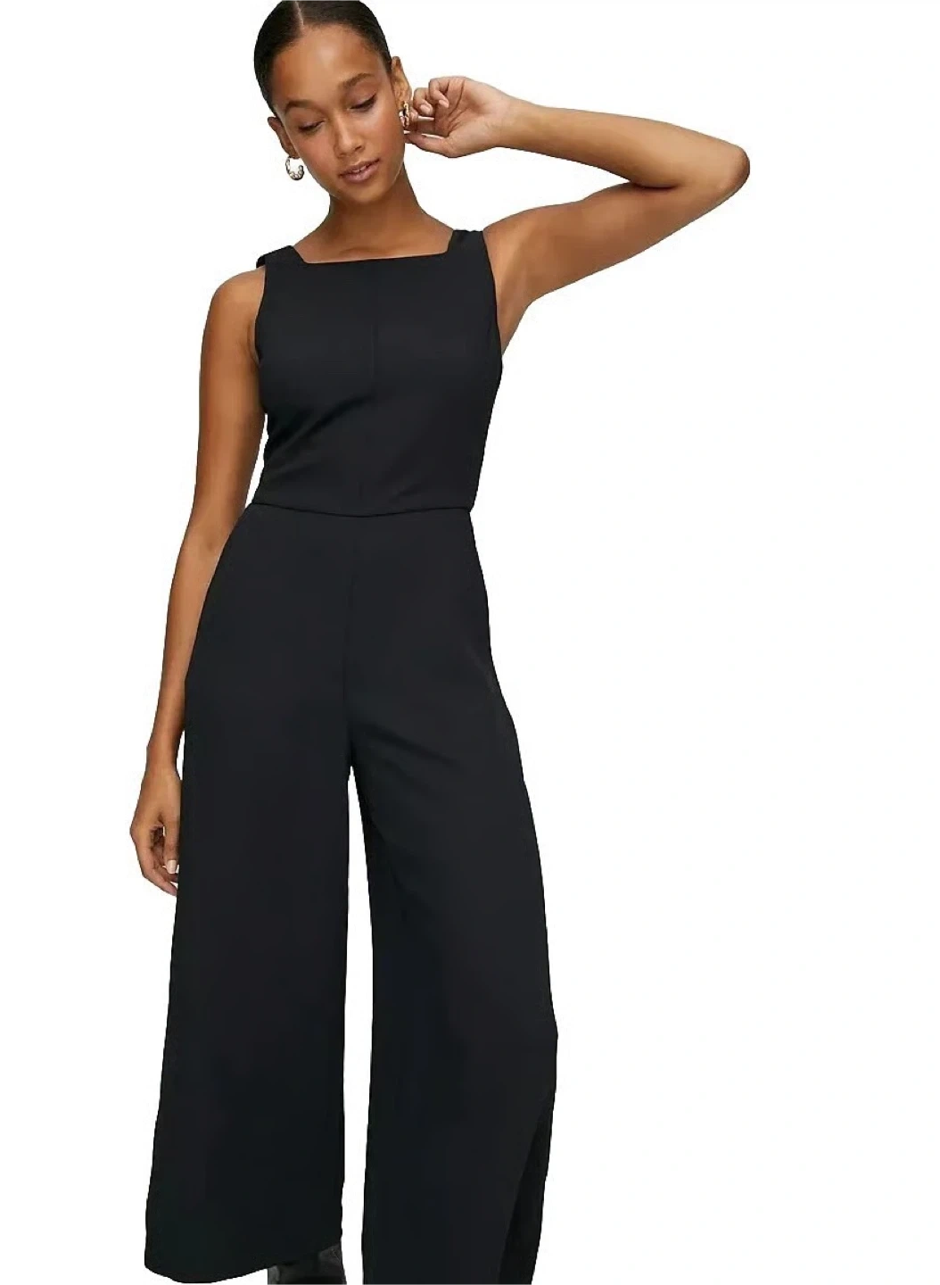 This stylish black jumpsuit features a square neckline and a flattering wide-leg silhouette. It ties at the back for a chic.