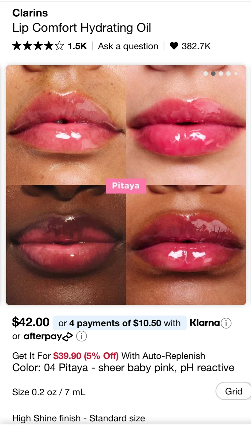 This Clarins Lip Comfort Hydrating Oil provides a sheer baby pink shade. It's a pH reactive formula with a high shine finish. The oil is 1.4 mL.