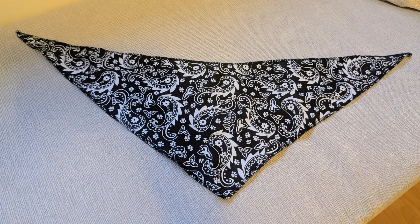 A classic black and white bandana with a paisley pattern. This fabric accessory is lightweight and has a traditional bandana shape. It's perfect for adding a touch of style or for various practical uses.