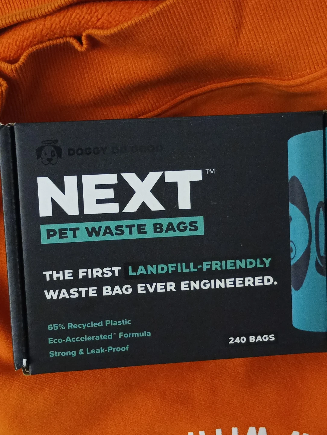 NEXT Pet Waste Bags by Doggy Do Good. These bags are landfill-friendly and feature an eco-accelerated formula. Made with 65% recycled plastic, they're strong and leak-proof. Includes 240 bags per box.