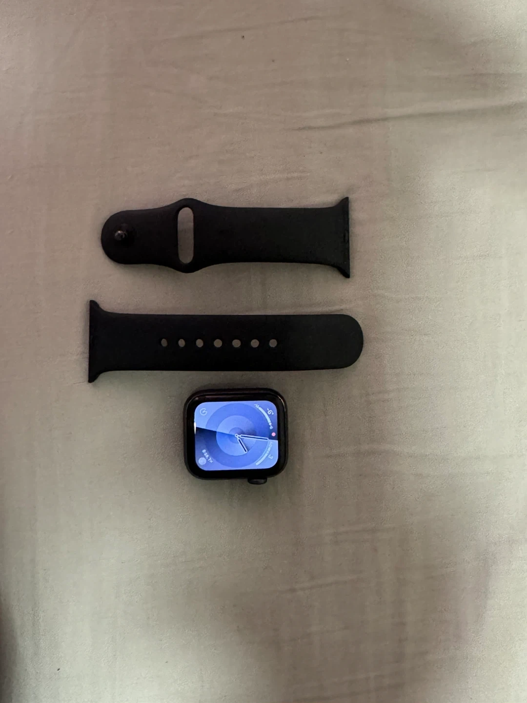 This is an Apple Watch SE (GPS) in space grey. It comes with two black sport bands. It's a great smartwatch for tracking your fitness and staying connected.