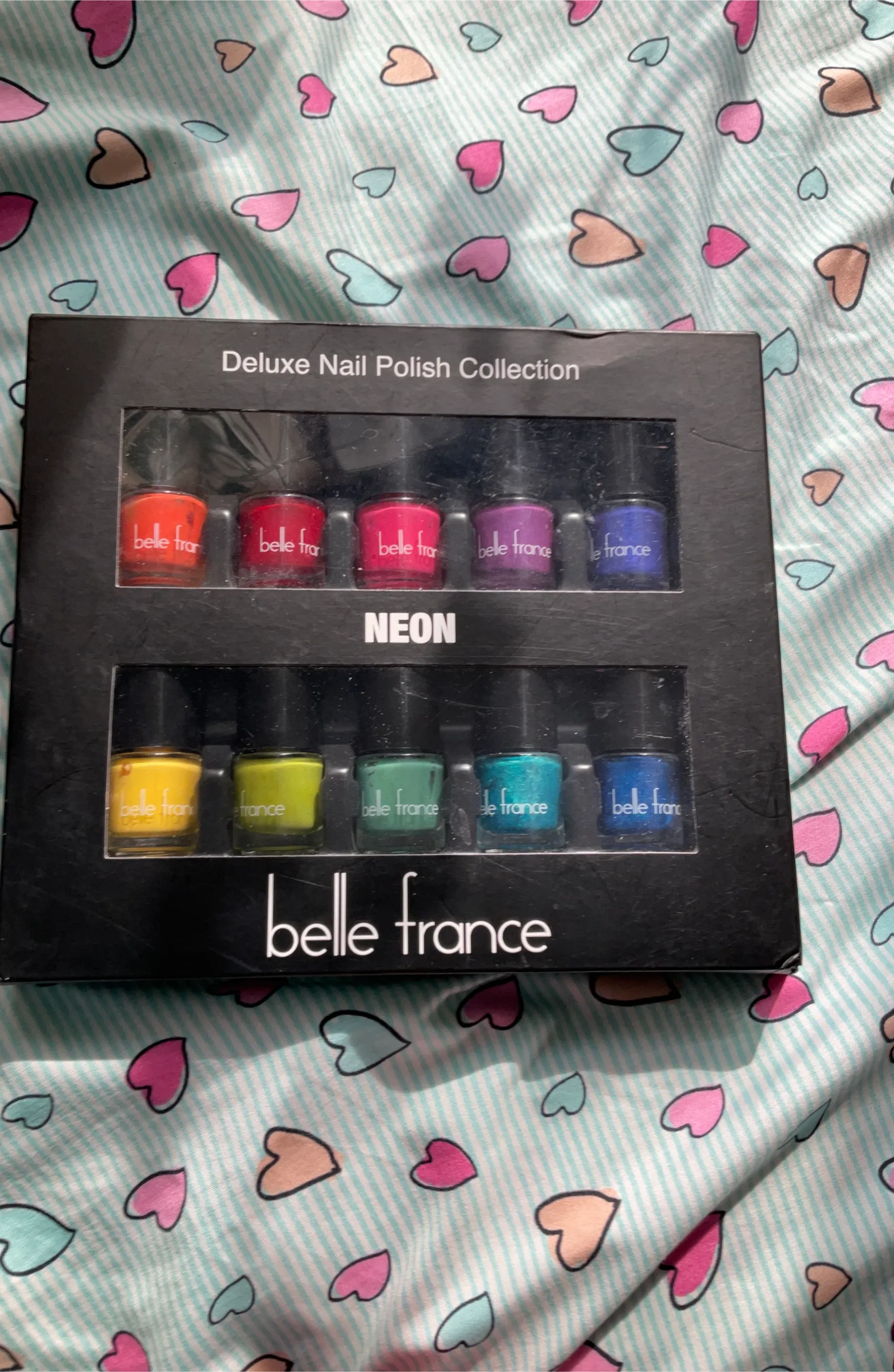This is a Belle France Deluxe Nail Polish Collection featuring neon colours. It includes 10 mini nail polish bottles with a variety of bright shades. The collection is perfect for creating vibrant manicures and pedicures.