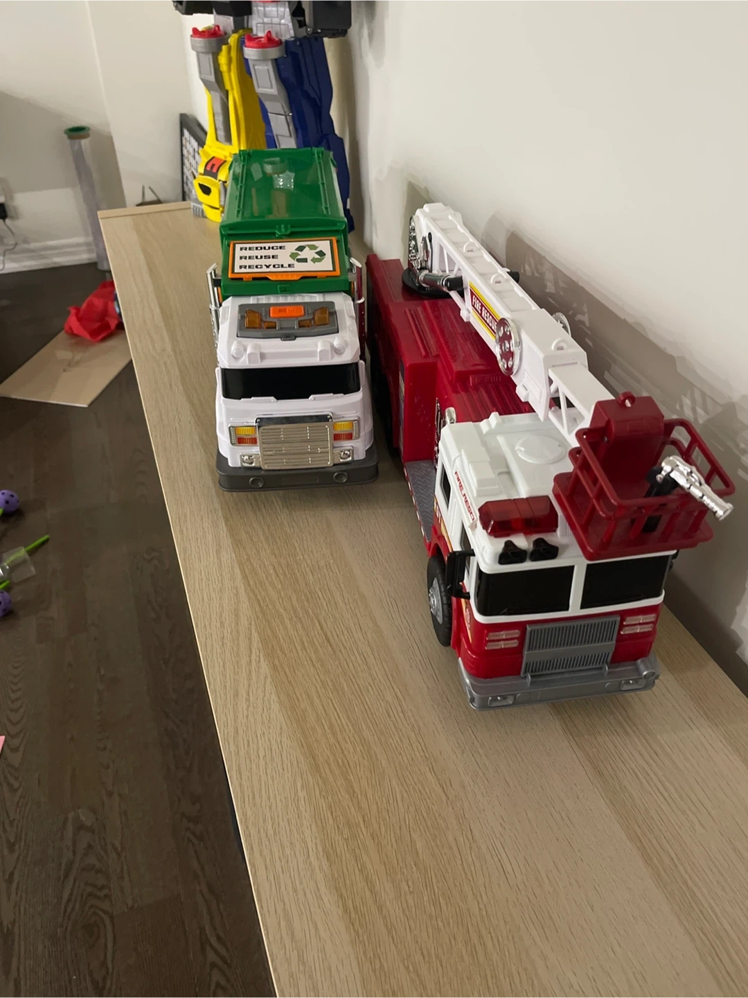 A green recycling truck with "REDUCE REUSE RECYCLE" signage. It's accompanied by a red and white "FIRE RESCUE" truck with a ladder.