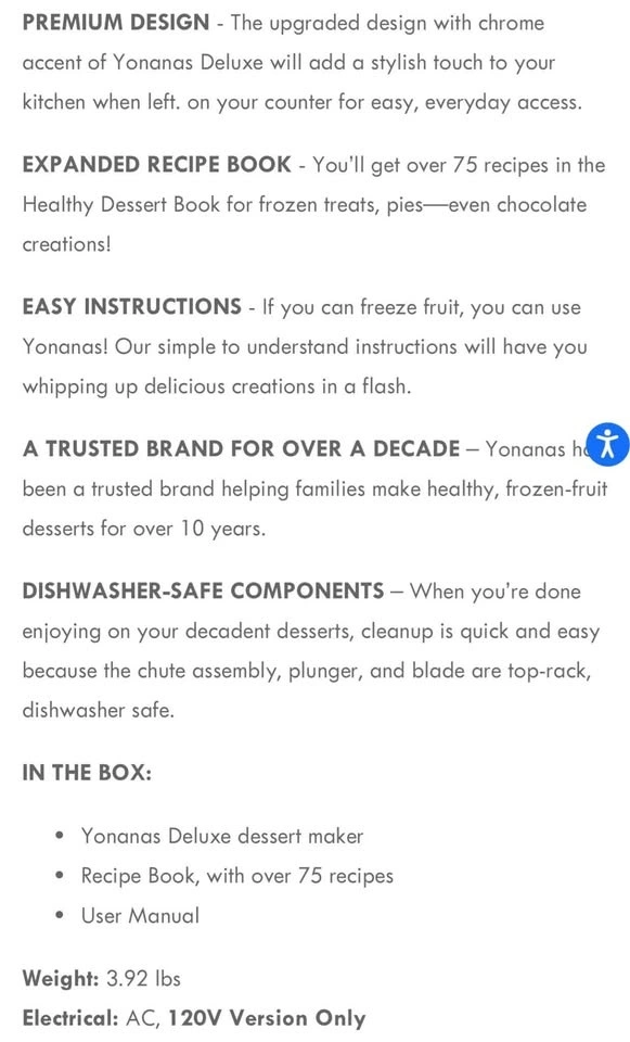 With Yonanas, turn frozen fruit into dessert in seconds! Instantly make wholesome, delicious, vegan, and dairy-free desserts with no added fats, sugars, or additives. Create your own or follow the included recipes. All removable parts are top-rack, dishwasher safe, and BPA free.