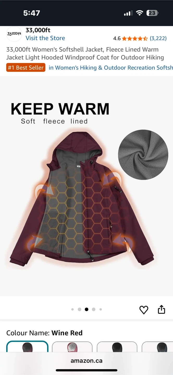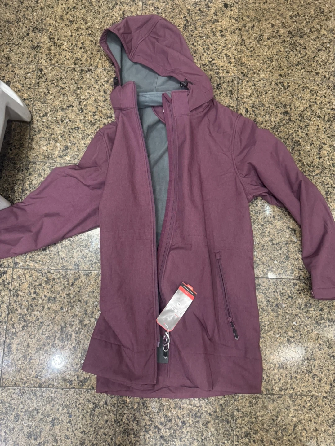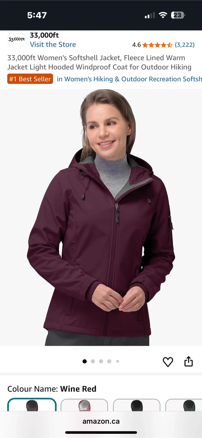 This women's softshell jacket is fleece-lined and windproof. It features an adjustable hood and a drawcord hem. Made for outdoor activities like hiking. Available in Wine Red.