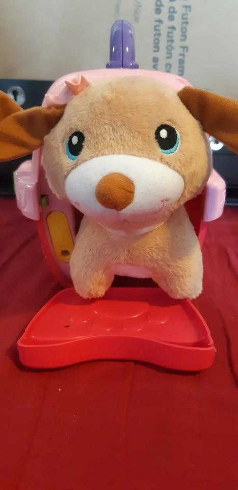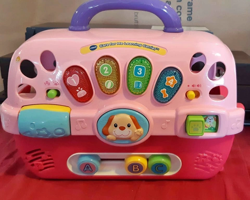 This is an interactive pet carrier designed for children aged 9 to 36 months. The toy features light-up buttons that introduce colors, shapes, and pet care, along with sliding letter beads for learning letters and music. It plays over 100 songs, melodies, sounds, and phrases. Tested and verified. Please check out my other listings!