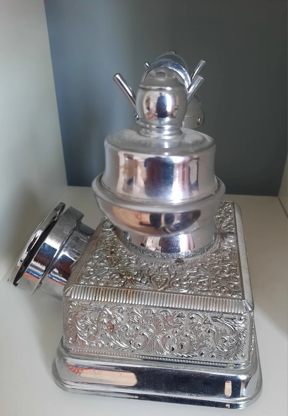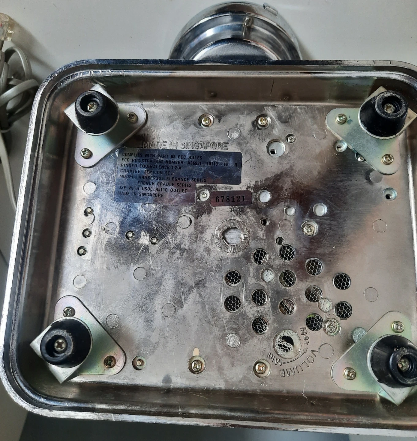 This is a Vintage Rotary Telephone with an ornate silver-tone finish. Made of metal. It features intricate embossed detailing on the base and comes with cord. Made in Singapore. Perfect for collectors or anyone looking to add a vintage touch to their home!