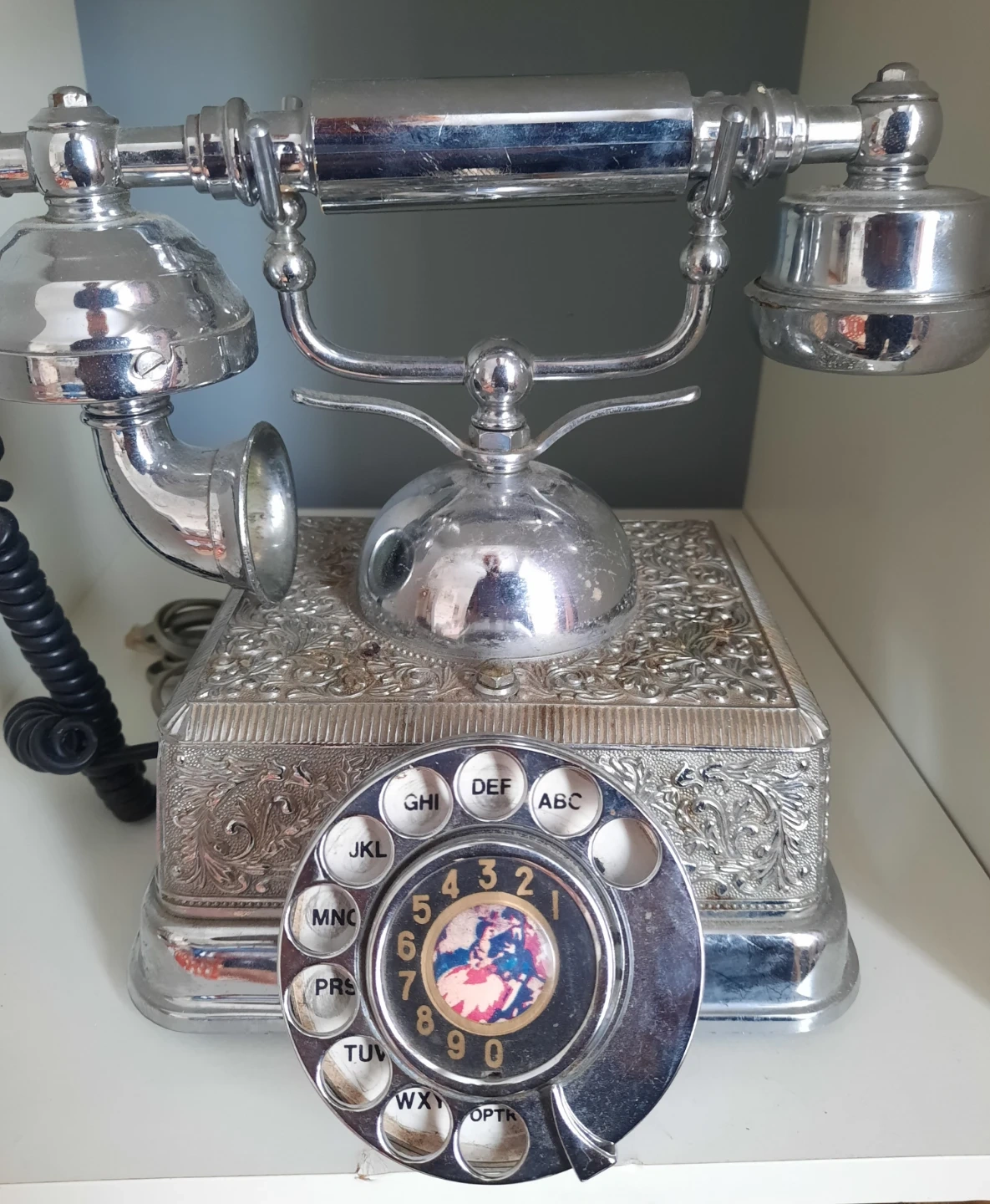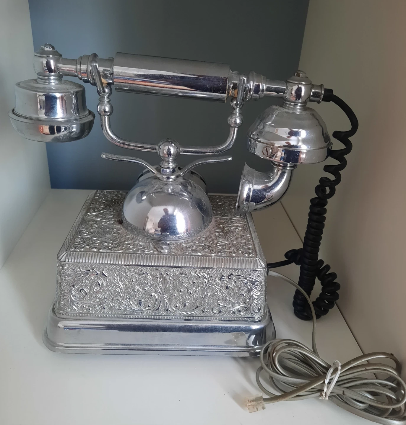 This is a Vintage Rotary Telephone with an ornate silver-tone finish. Made of metal. It features intricate embossed detailing on the base and comes with cord. Made in Singapore. Perfect for collectors or anyone looking to add a vintage touch to their home!