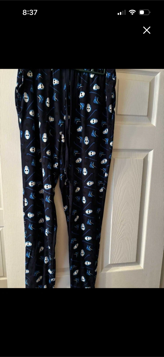 These navy blue pyjama pants have an all-over print of hockey masks, skates, and sticks. Men’s medium.