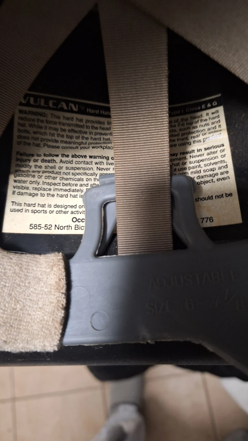This is a VULCAN Type I, Class G & E hard hat. It features an adjustable suspension system for a snug fit. The size is 6 7/8.