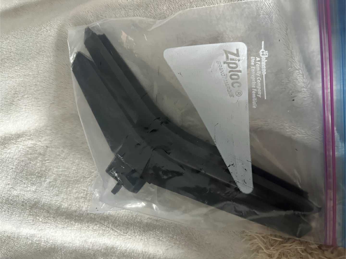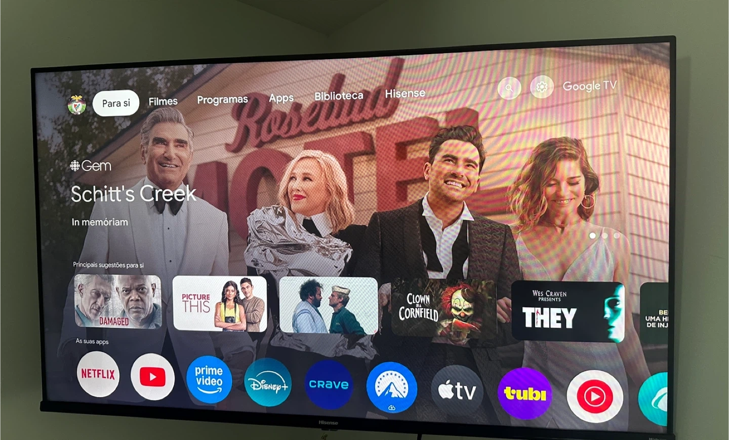 This is a Hisense smart TV. It comes with a remote control. Also includes two black stand pieces. The TV has Google TV and pre-loaded apps like Netflix, YouTube, and Disney+.
