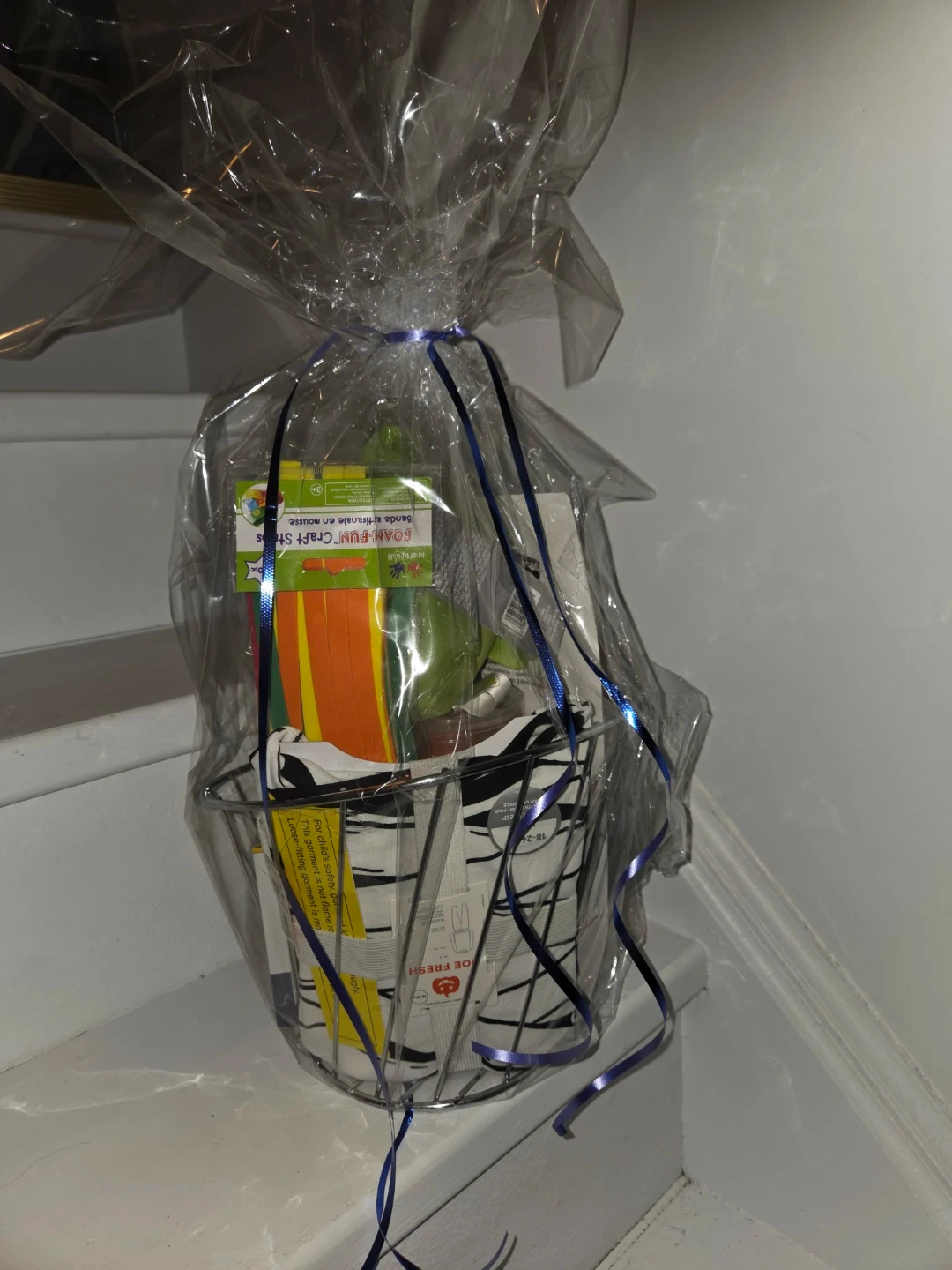 A fun craft basket featuring a Schleich wild animal figurine. It includes craft supplies and a cute dinosaur item. Perfect for creative kids! You get to enjoy play time in a mummy pajama for a kid 18-24 months of age!