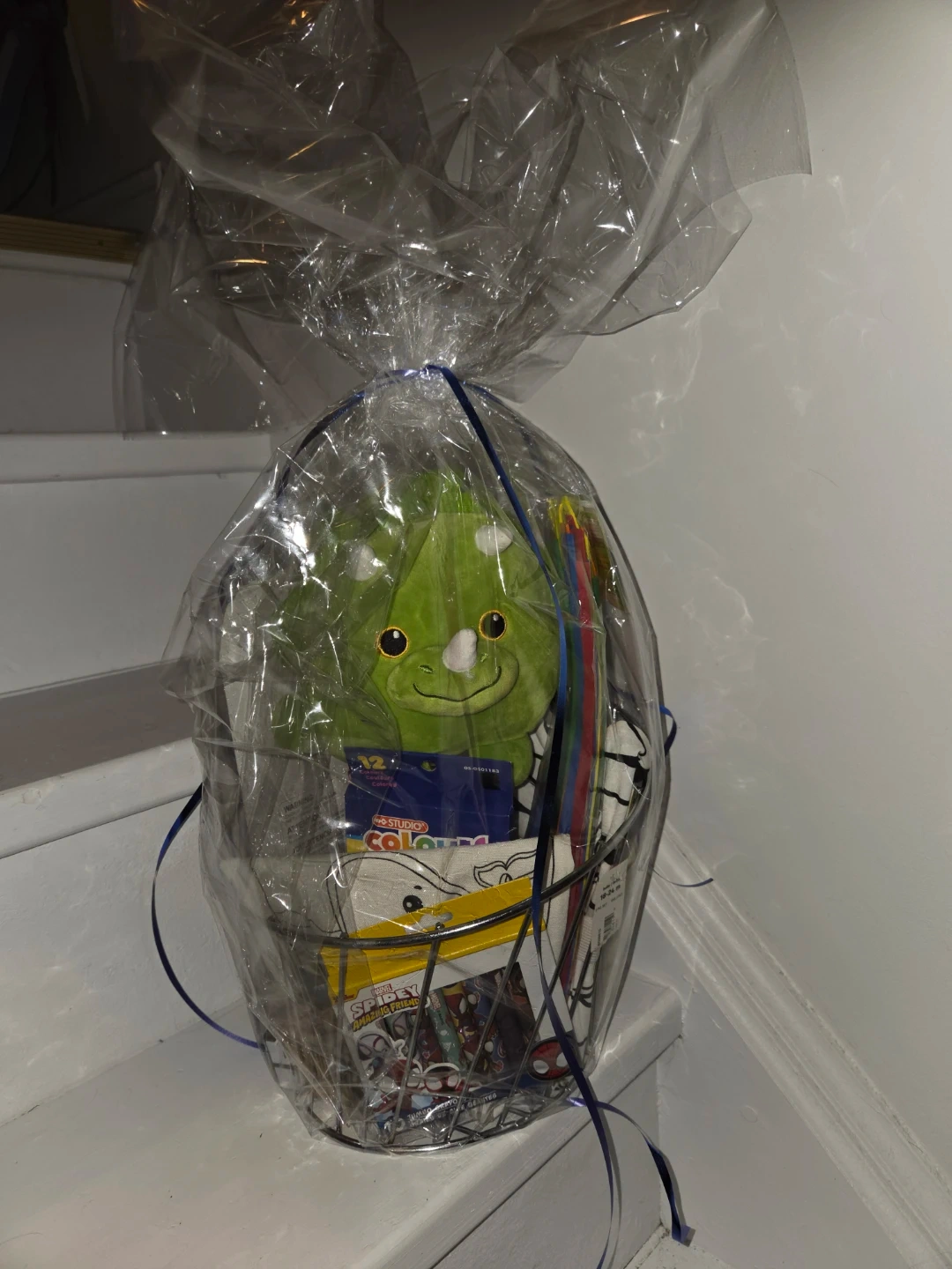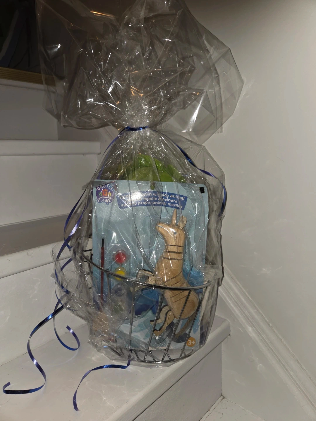 A fun craft basket featuring a Schleich wild animal figurine. It includes craft supplies and a cute dinosaur item. Perfect for creative kids! You get to enjoy play time in a mummy pajama for a kid 18-24 months of age!