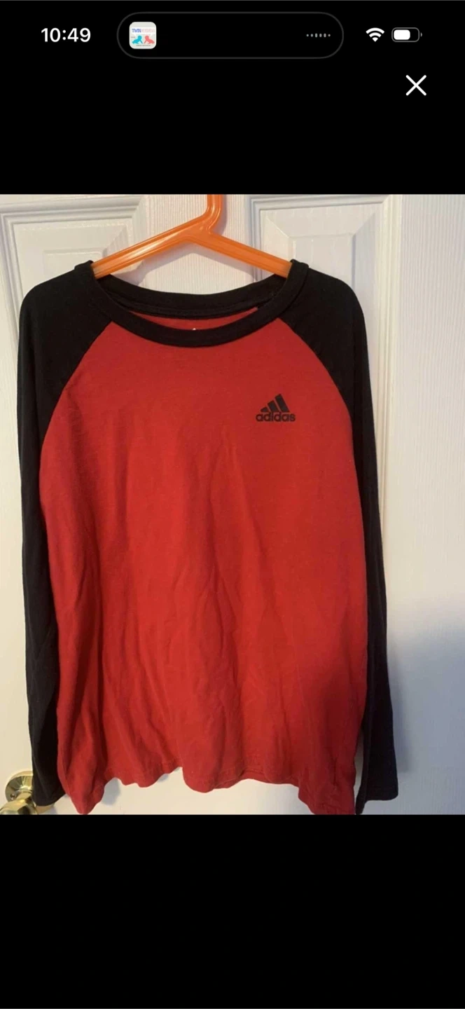 This is an Adidas long sleeve raglan shirt in red and black. It features a small Adidas logo on the chest. Boys medium 10-12.