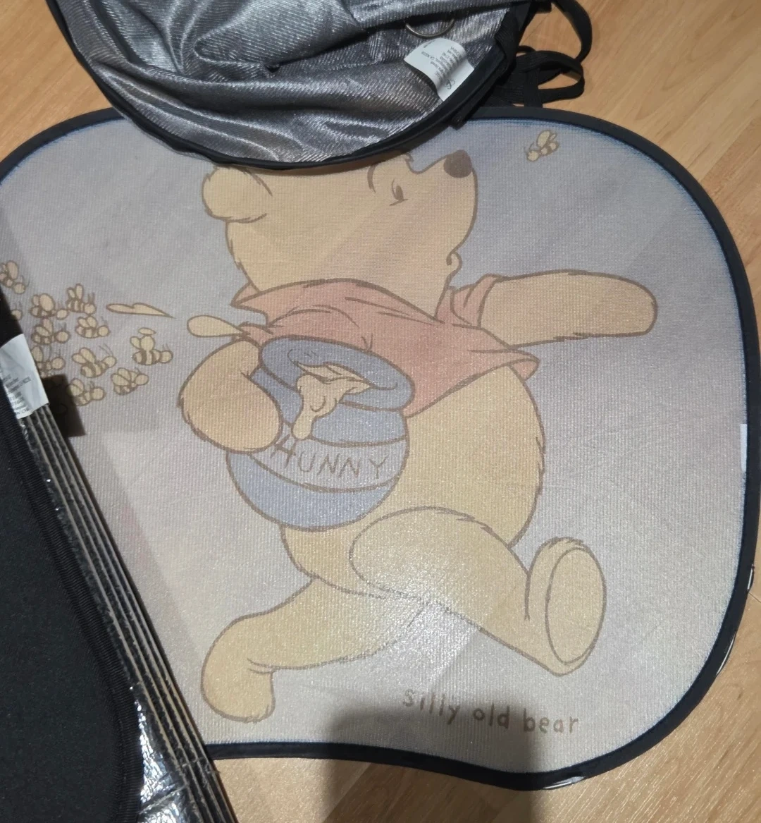 Set of two car sun shades, one featuring Winnie the Pooh and the other a reflective design. They're great for keeping your car cool on sunny days. The reflective shade rolls up for easy storage.