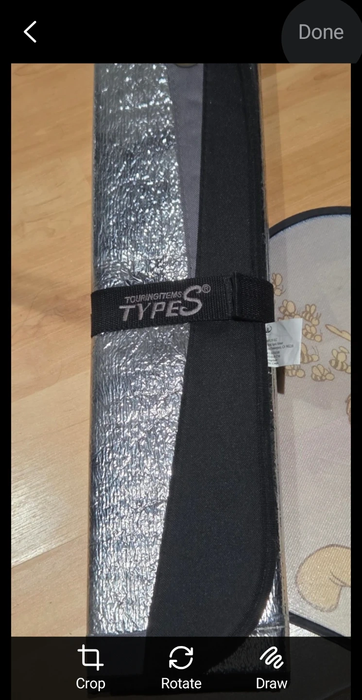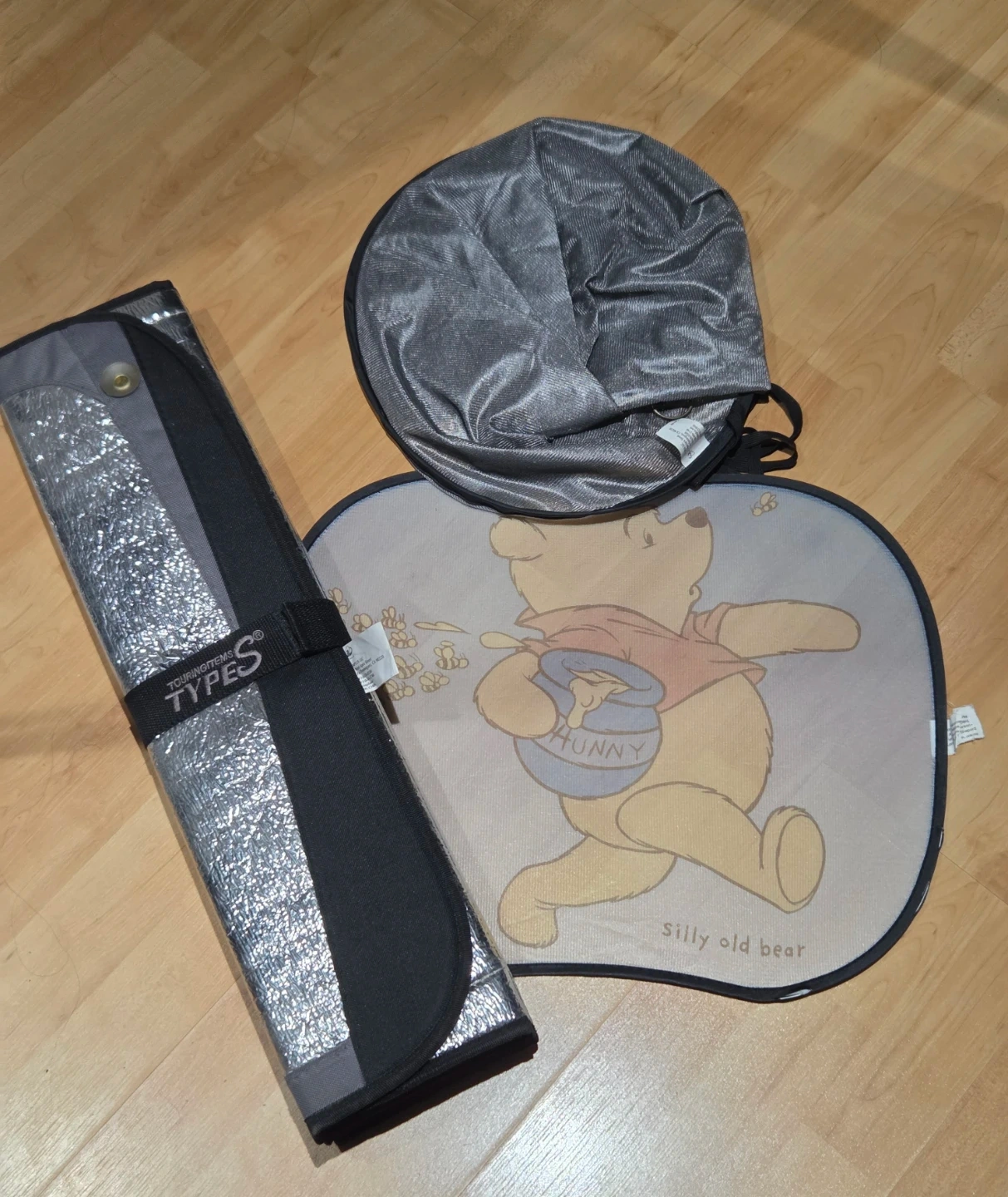 Set of two car sun shades, one featuring Winnie the Pooh and the other a reflective design. They're great for keeping your car cool on sunny days. The reflective shade rolls up for easy storage.