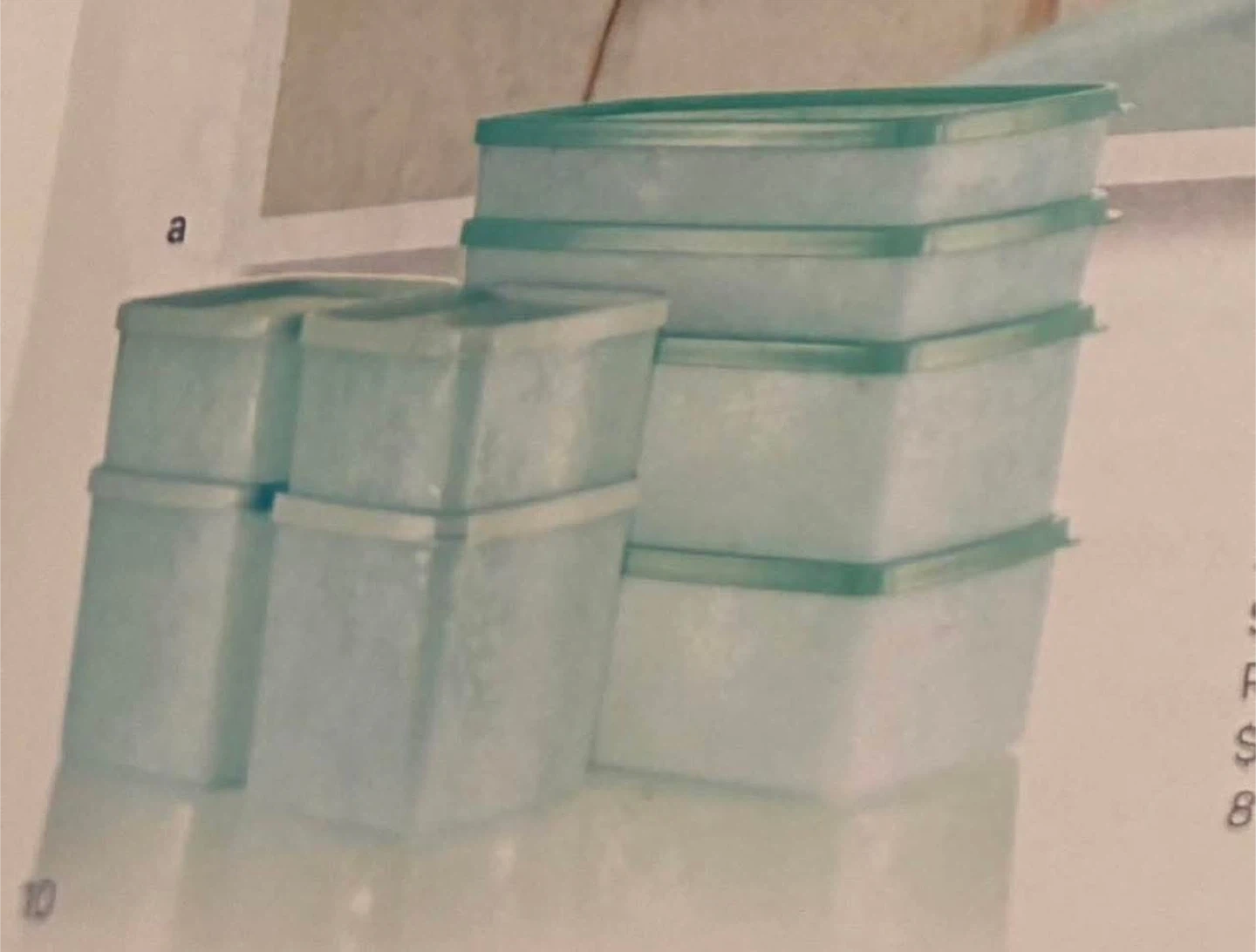 This is a set of seven clear food storage containers with green lids. They are stackable for convenient storage. The set includes various sizes to accommodate different food items.