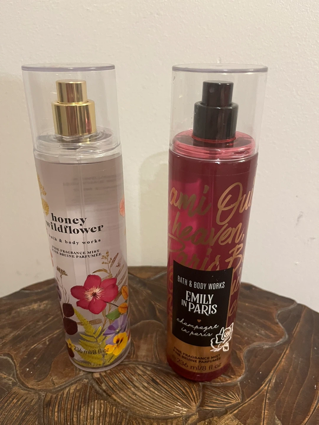 Two fine fragrance mists from Bath & Body Works. Includes 'Honey Wildflower' and 'Emily in Paris' scents. Each bottle is 236 ml or 8 fl oz. These mists are great for a quick refresh throughout the day!