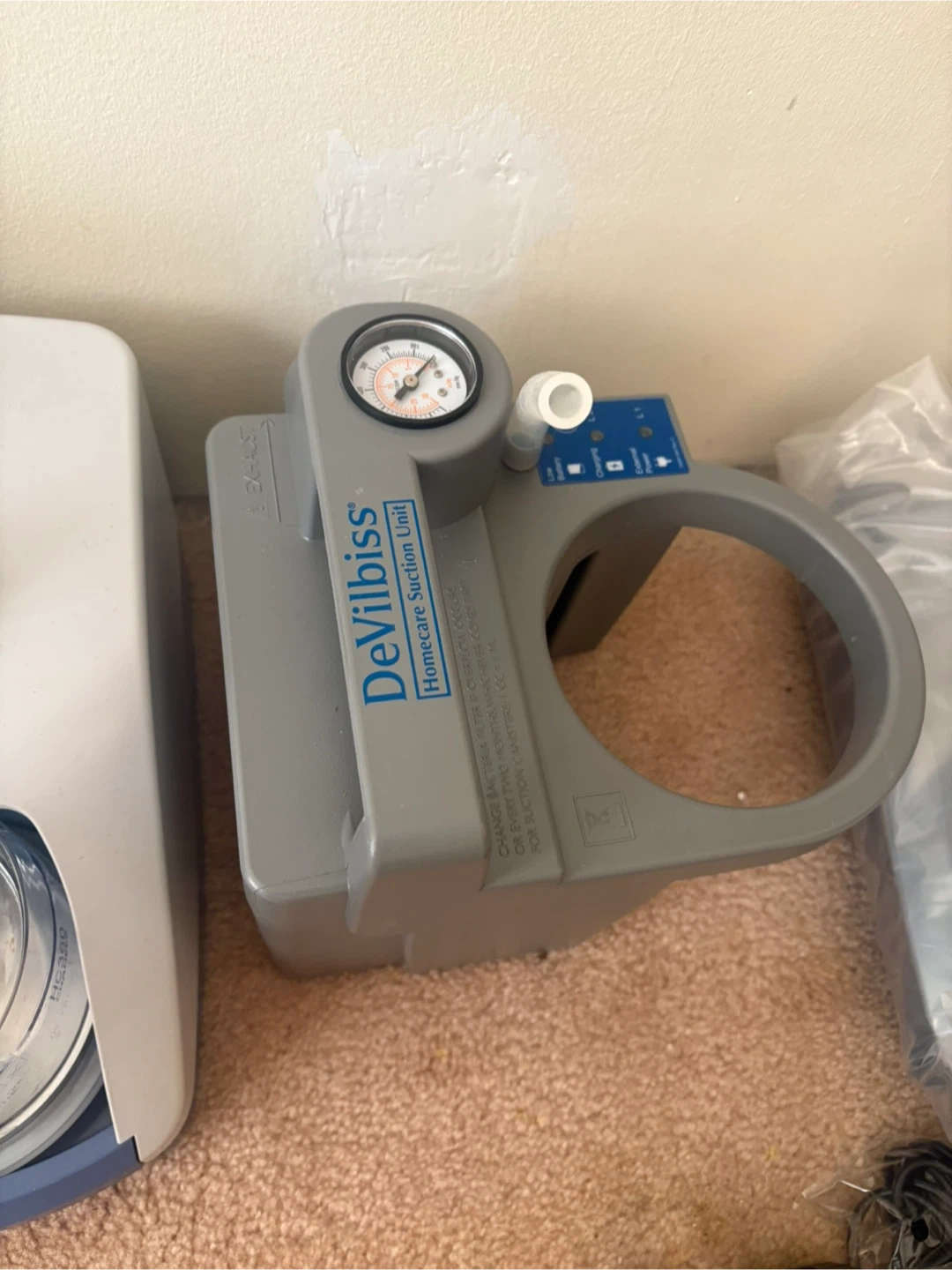 This is a DeVilbiss Homecare Suction Unit. It has a gauge to monitor pressure. The unit requires a bacteria filter that should be changed every two months or if overflow occurs.