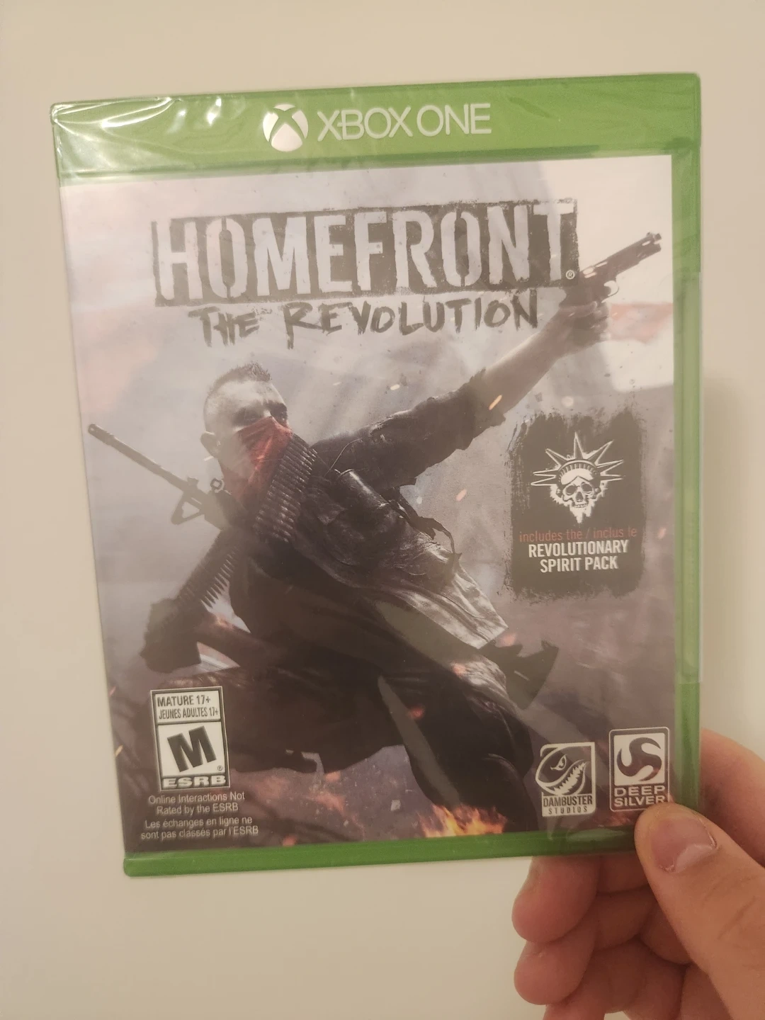 Homefront: The Revolution for Xbox One. Includes the Revolutionary Spirit Pack. It's rated M for Mature 17+ by ESRB. Online interactions are not rated by the ESRB.