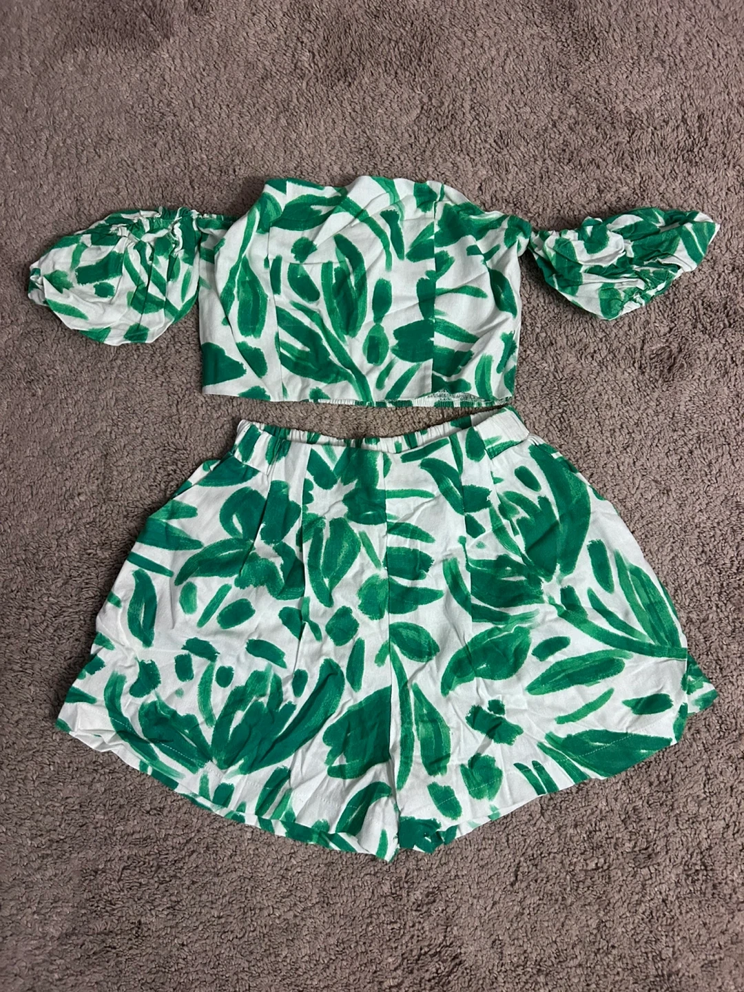 This two-piece set features a white crop top with a green abstract leaf print and off-the-shoulder design. It's paired with matching high-waisted shorts.