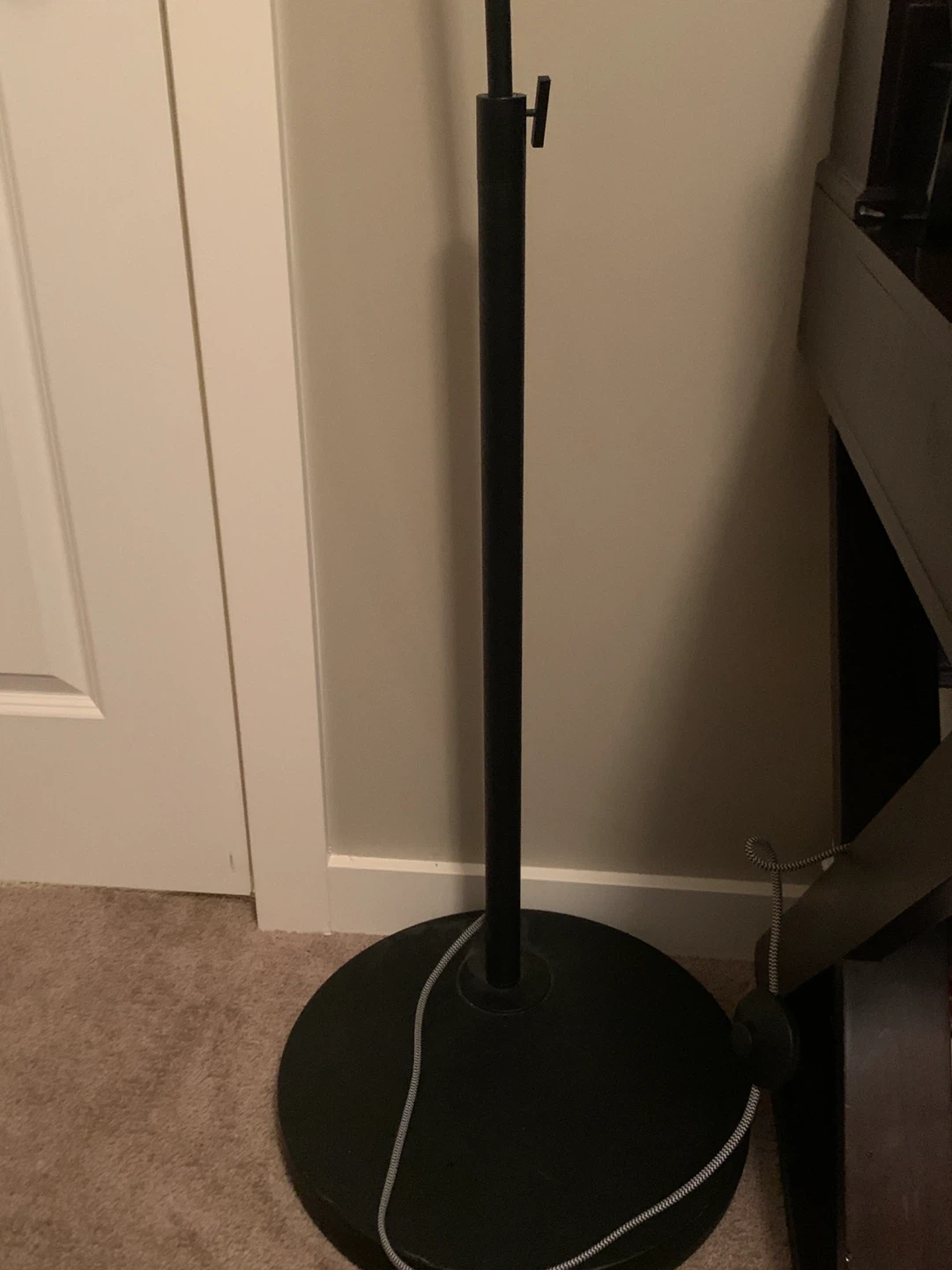 This arc floor lamp has a white conical shade and a black metal base and arm.