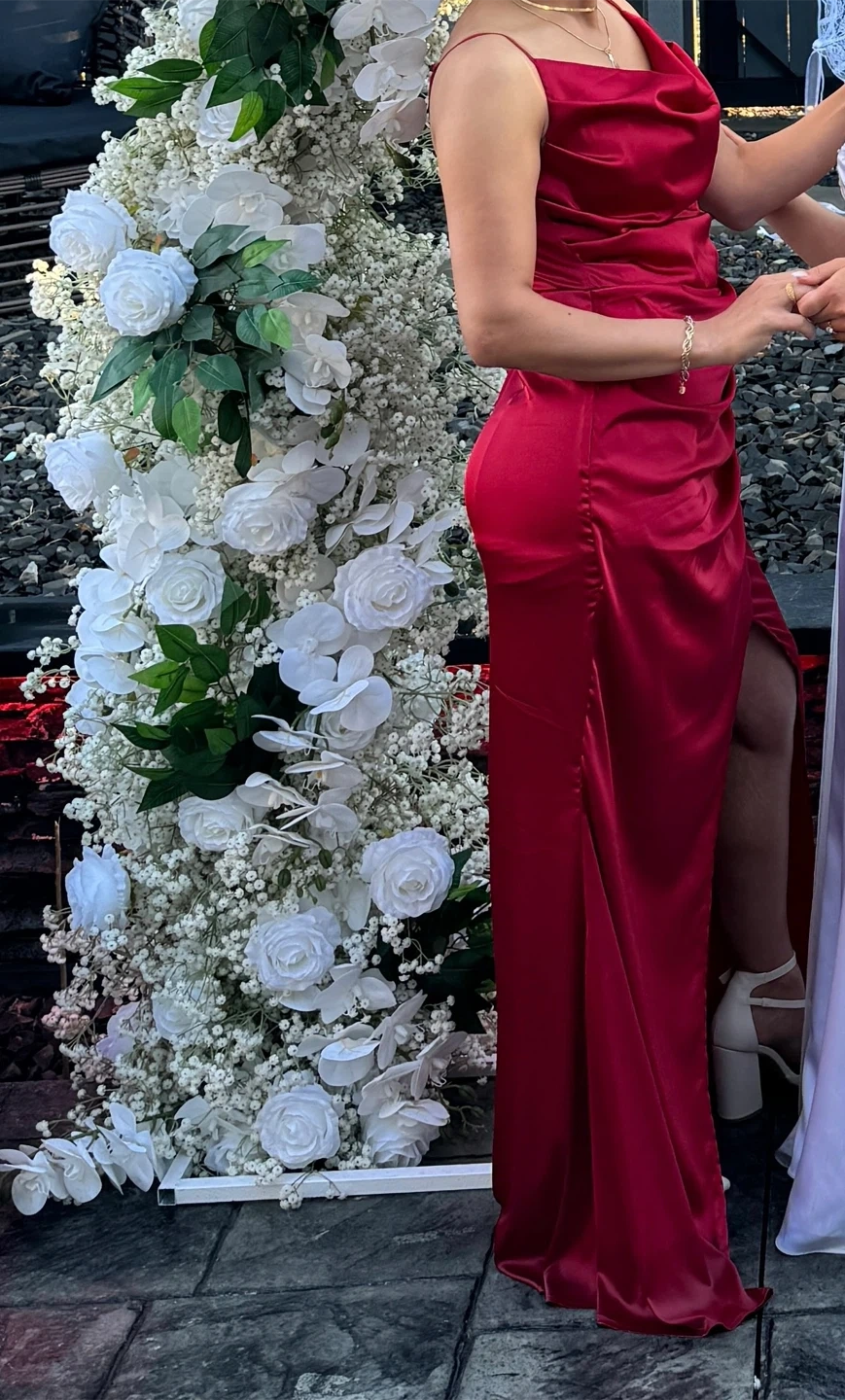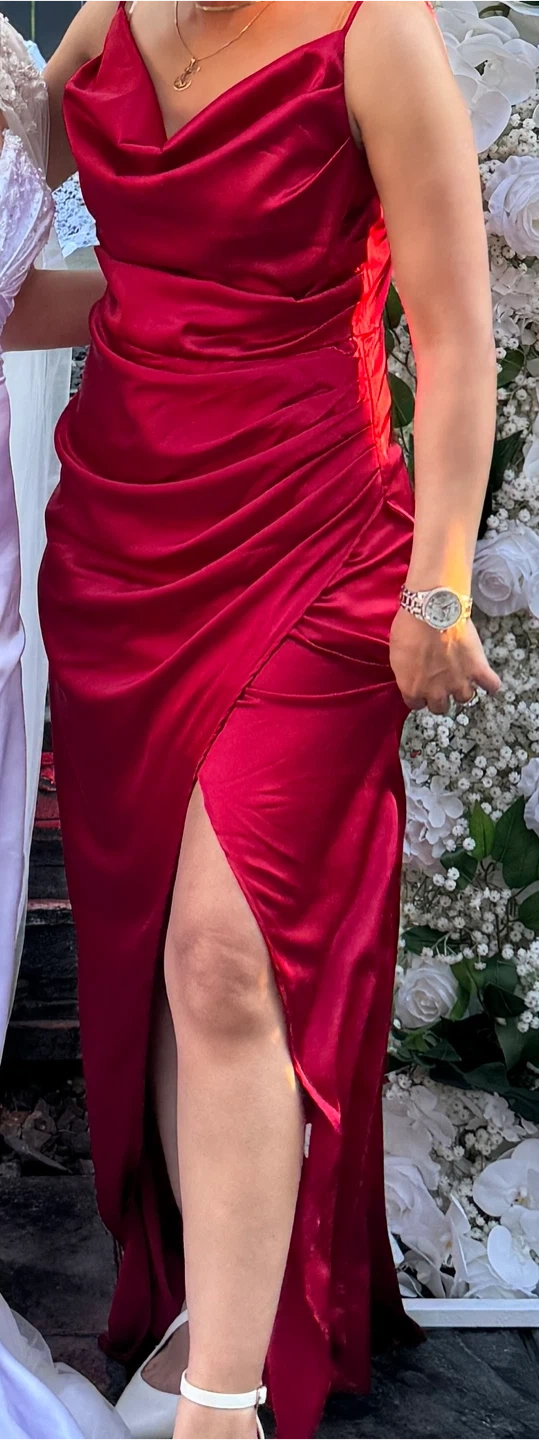 Gorgeous red satin cowl neck maxi dress. It features a flattering ruched bodice and a high slit for added flair. Perfect for any formal occasion! Valentine's Day π
