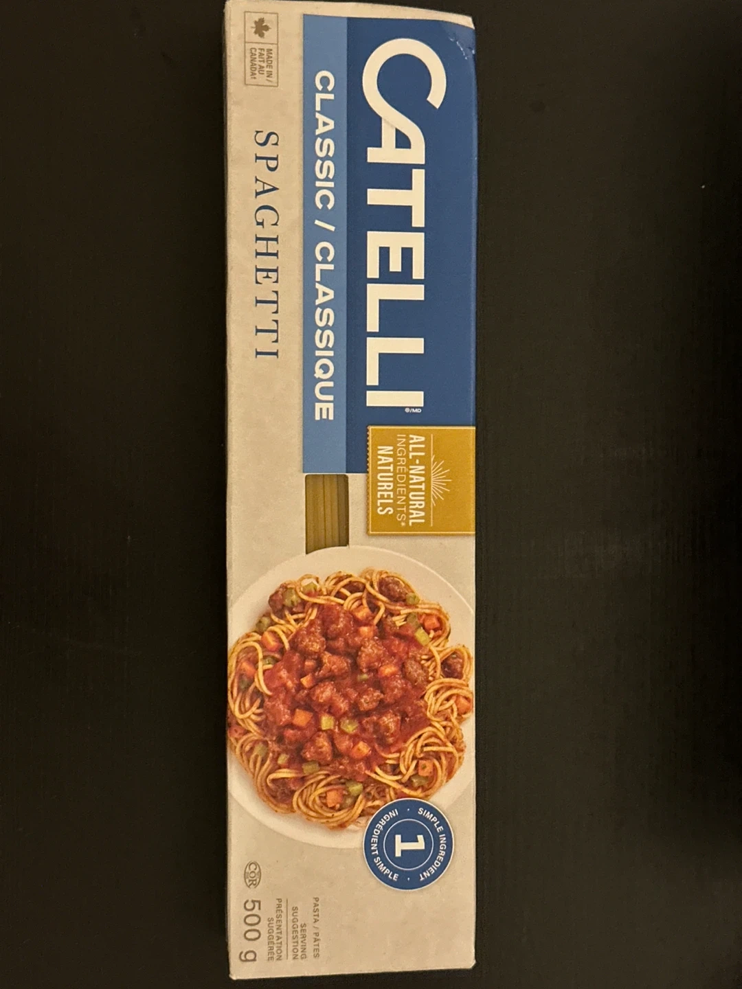 A box of Catelli Classic Spaghetti, weighing 500 grams. It's made with simple ingredients. Best before 2028-AL-01. This pasta is suitable for quick weeknight meals.